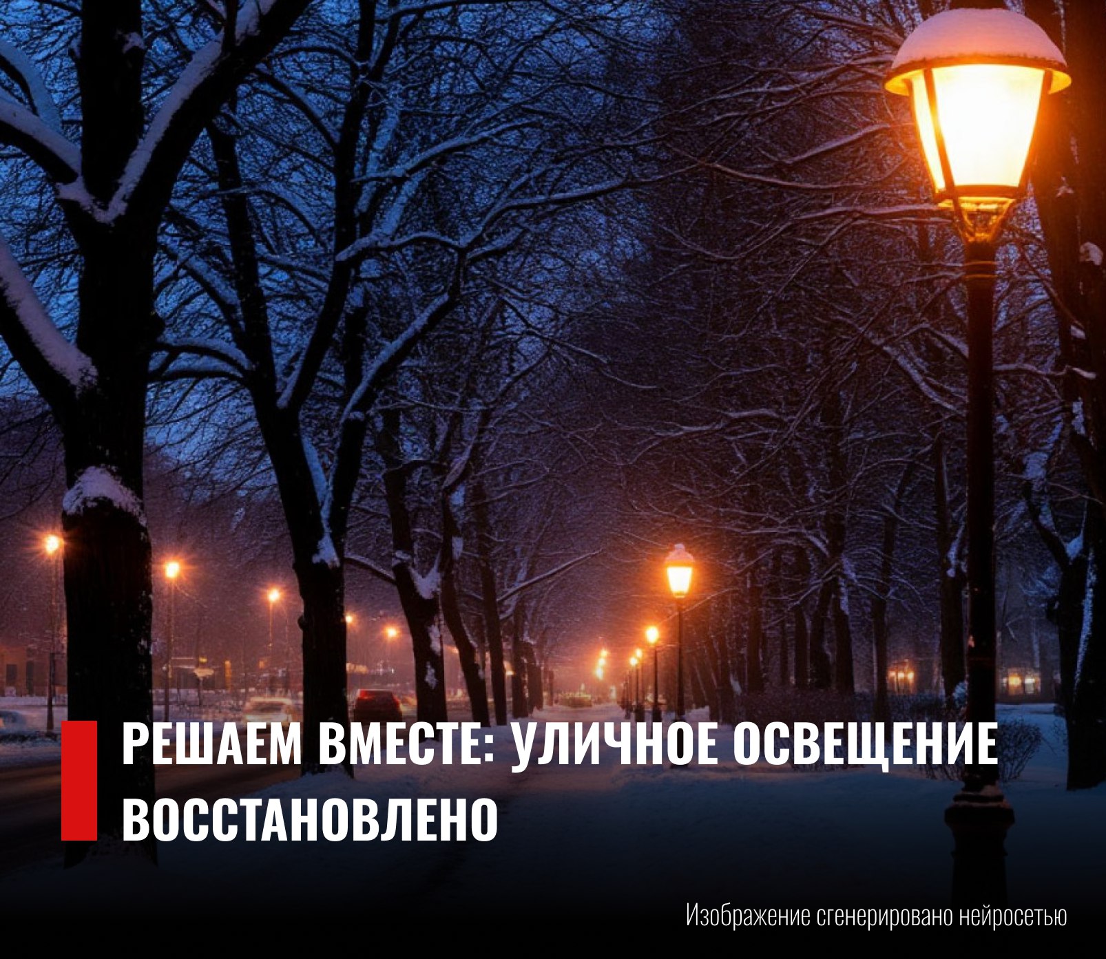 Платформа обратной связи (ПОС) – это простой и удобный способ получить решение городских вопросов. 14 декабря жители Рубцовска сообщили об отсутствии уличного освещения от перекрёстка улиц Тракторной и Мира в южном направлении. Специалисты приняли обращение в работу, подрядной организацией было восстановлено уличное освещение по указанному в обращении участку.