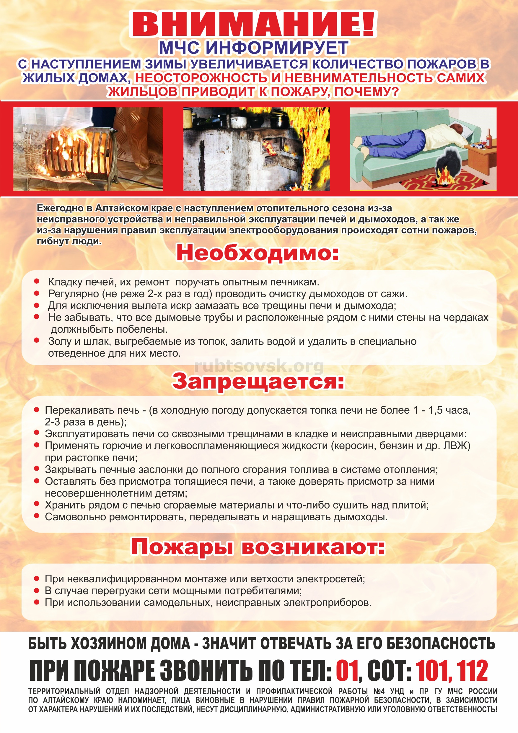 МКУ «Управление по делам ГОЧС г. Рубцовска» еще раз напоминает о необходимости соблюдения правил пожарной безопасности и информирует, что с началом отопительного сезона на территории города резко возросло количество пожаров вследствие нарушения правил эксплуатации печного отопления и электрообогревателей.