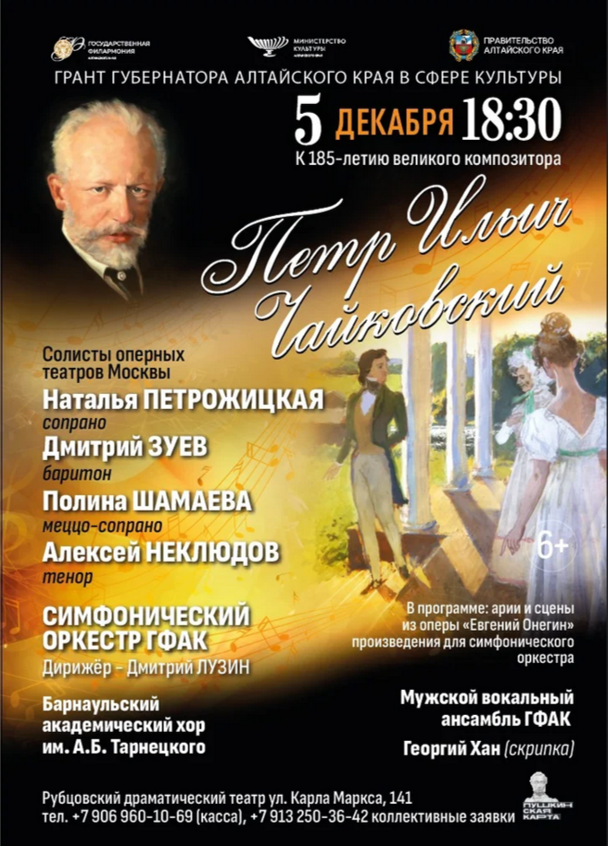 В этом году исполняется 185 лет со дня рождения великого композитора. В честь этого события, благодаря гранту Губернатора Алтайского края, в Рубцовском драматическом театре состоится торжественный музыкальный вечер.