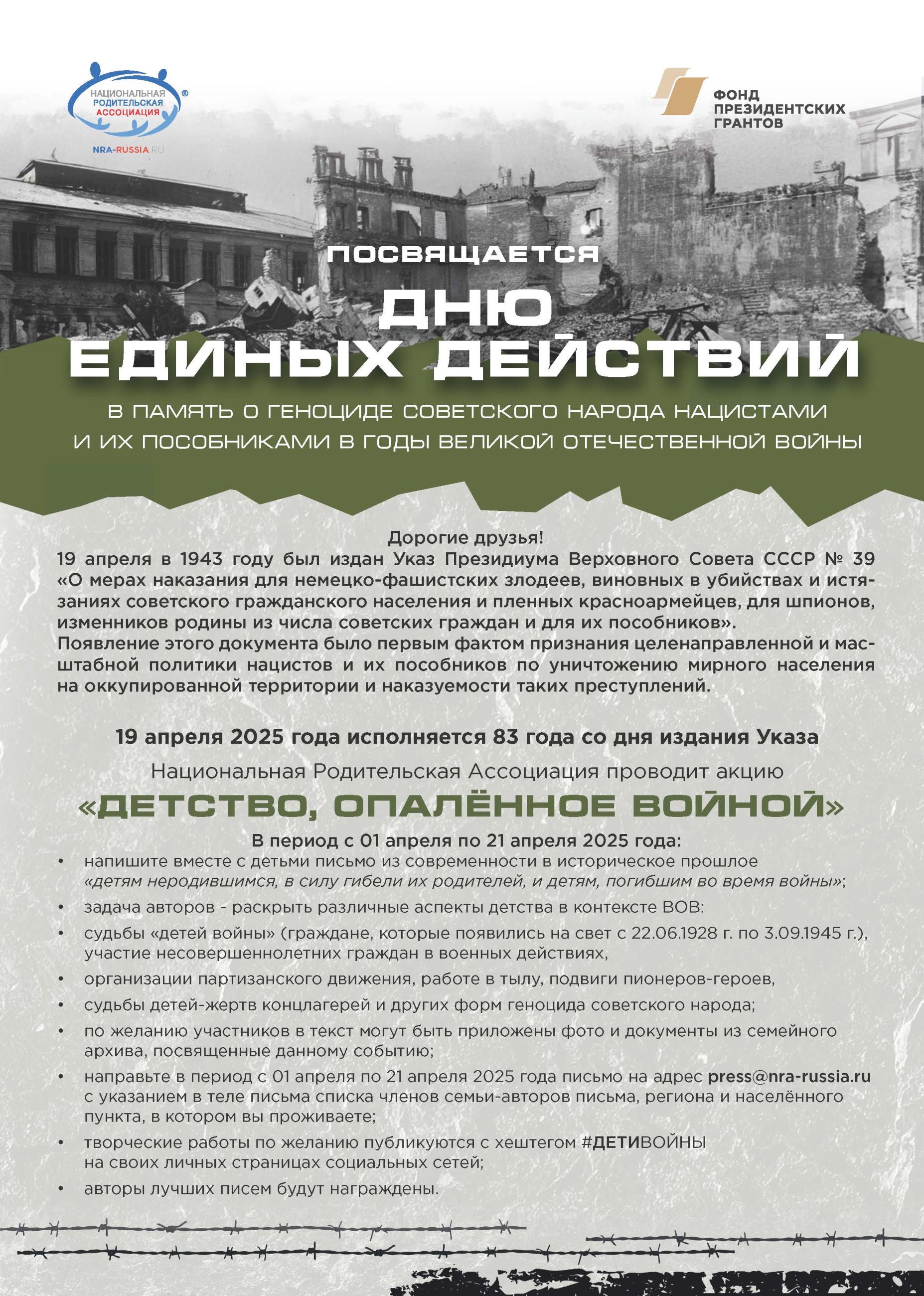 Национальная Родительская Ассоциация проводит акцию «Детство, опаленное войной». В период с 1 апреля по 21 апреля: