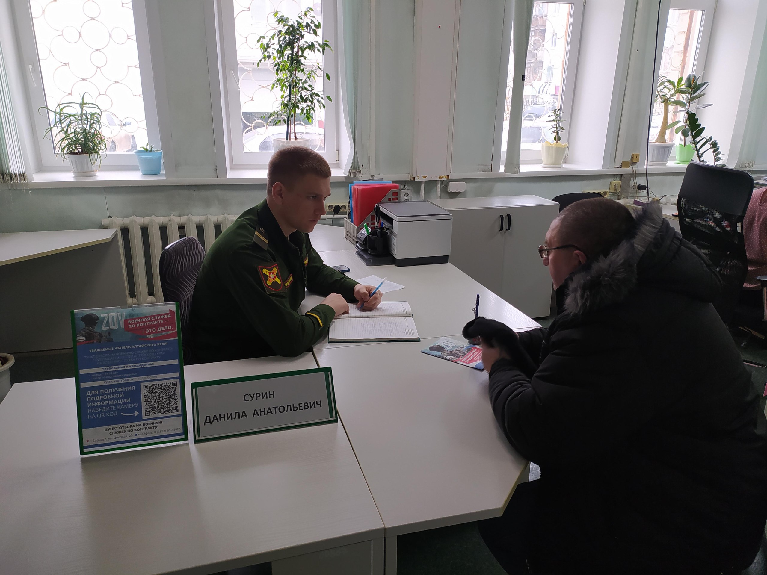 Представитель военкомата проводит информационные консультации, на которых можно узнать о возможностях поступления на военную службу по контракту в Вооруженные силы Российской Федерации, о предоставляемых льготах и гарантиях.