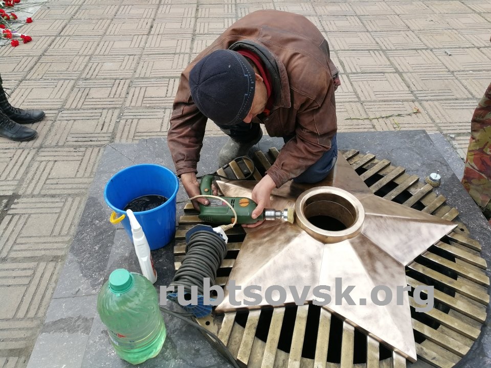 Кстати, сам Вечный огонь сегодня погашен: здесь выполняют профилактические работы. Одна из задач – очистка и полировка звезды, обрамляющей пламя.