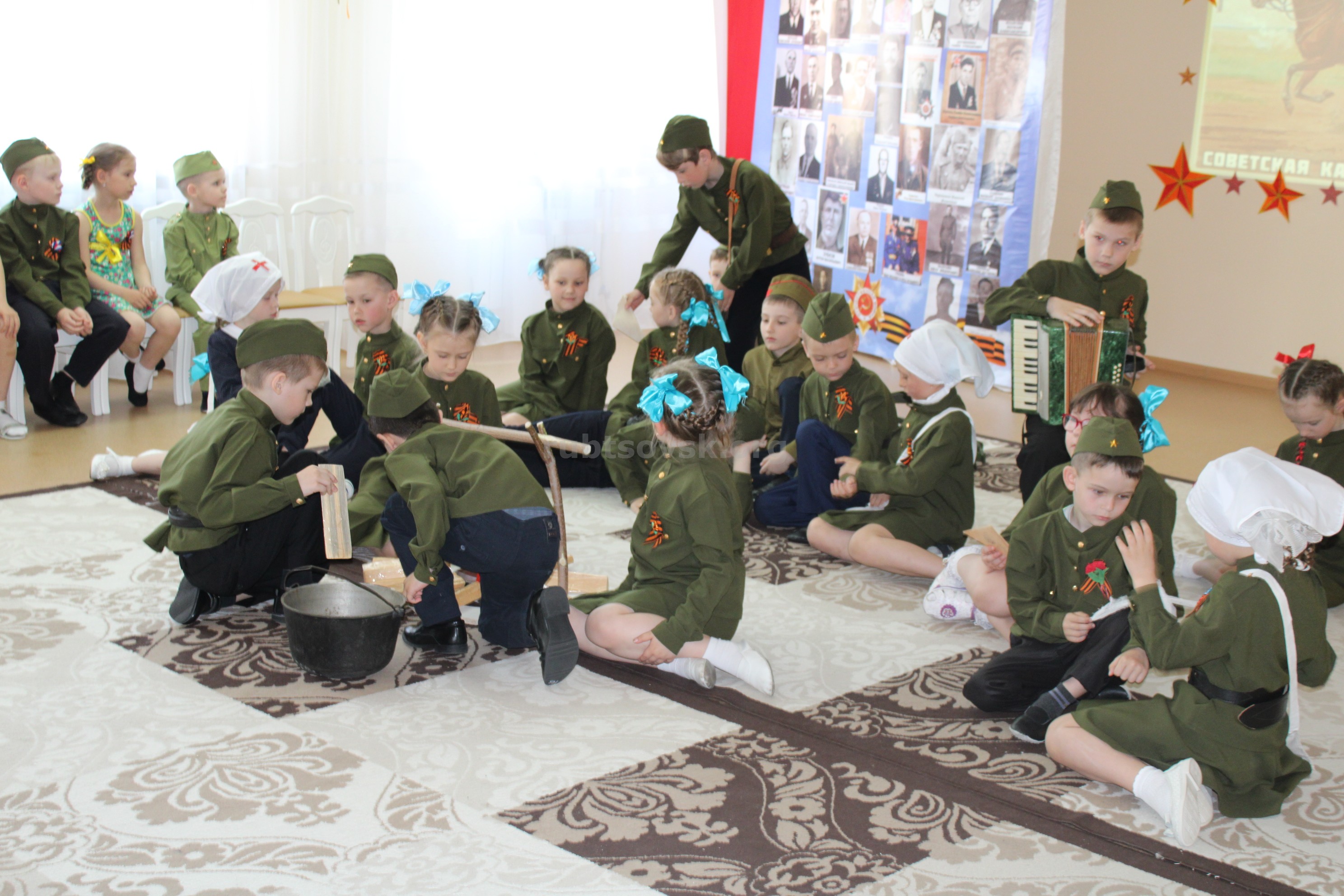 Воспитанники детского сада показали гостям настоящее представление на военную тематику, в котором были и стихотворения, и песни, и танцы, и короткие постановки.