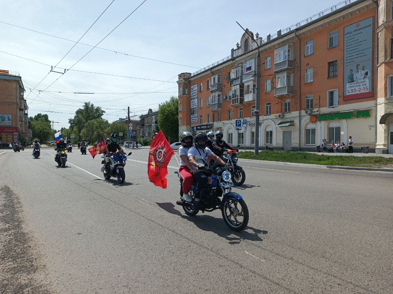 Автомобили и мотоциклы проезжали мимо домов, украшенных флагами и портретами участников Великой Отечественной войны. Этот автопробег — символ памяти и уважения к тем, кто подарил нам мирное небо над головой.