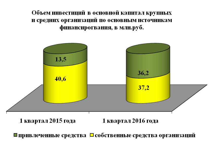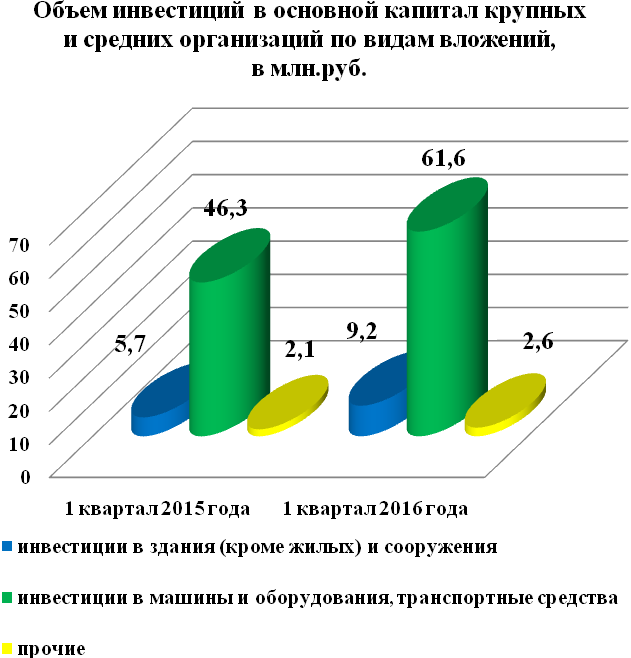 Инвестиции в основной капитал по крупным и средним организациям за 1 квартал 2016 года составили 73,4 млн. руб. или на 19,3 млн.руб. больше 1 квартала прошлого года.