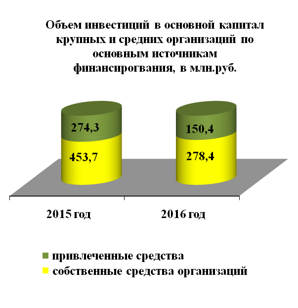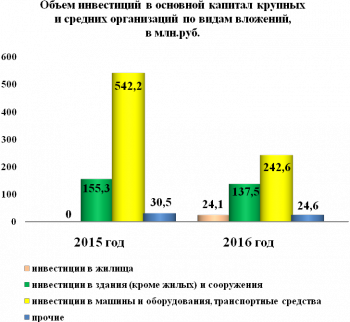 Инвестиции в основной капитал по крупным и средним организациям за 12 месяцев 2016 года составили 428,8 млн. руб. или на 223,3 млн. руб. меньше, чем за прошлый год.