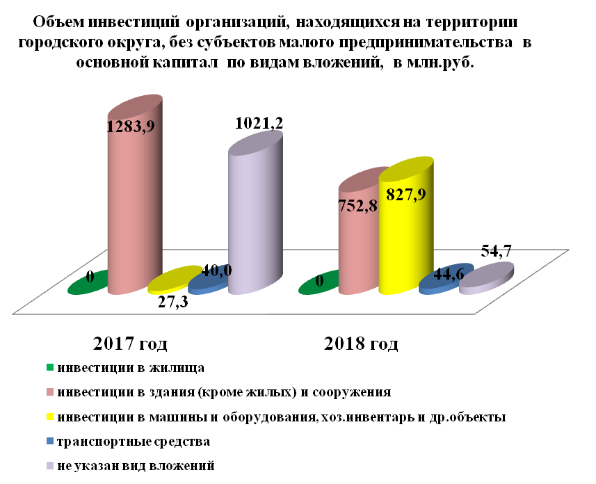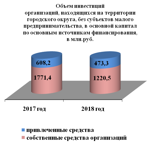 Инвестиции в основной капитал по организациям, находящимся на территории городского округа без субъектов малого предпринимательства, за 2018 год составили 1693,79 млн. руб., что меньше прошлогоднего объема 2379,6 млн. руб. на 28,7%.