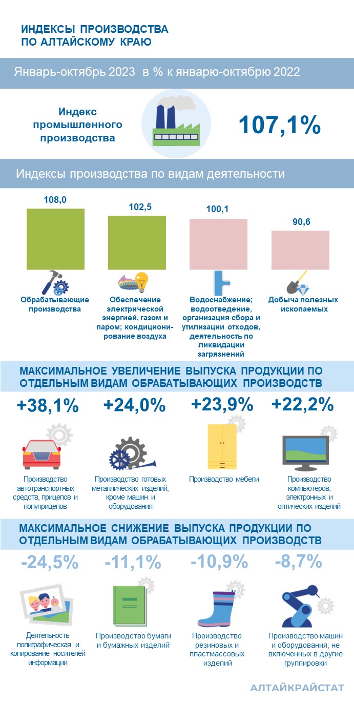 Индекс промышленного производства Алтайского края в январе-октябре 2023 года по сравнению с январем-октябрем 2022 года составил 107,1%.