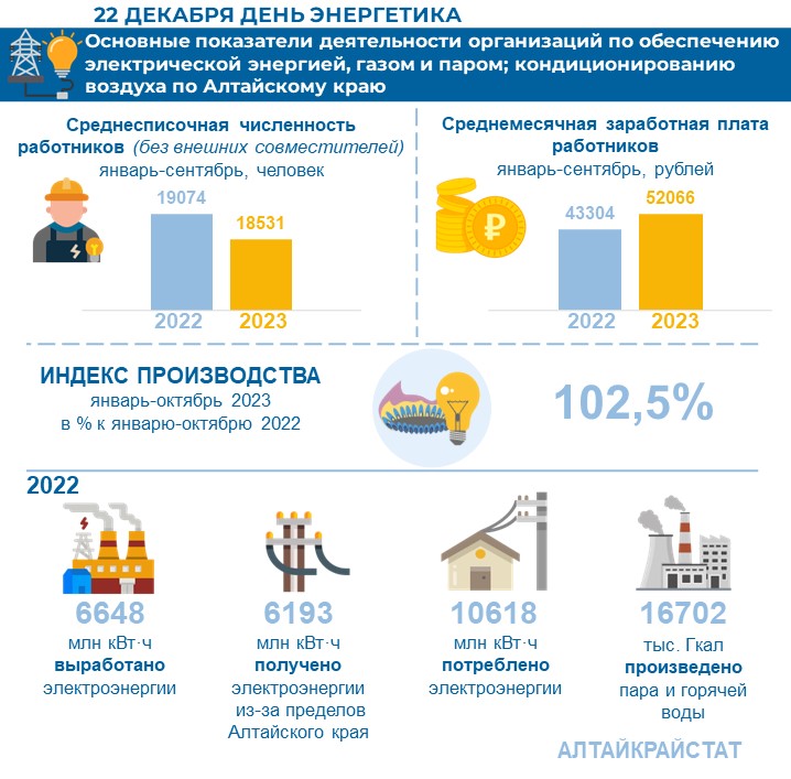 За январь-сентябрь 2023 г. деятельность в сфере обеспечения электрической энергией, газом и паром; кондиционировании воздуха в Алтайском крае осуществляли 329 организаций и их обособленные подразделения, на которых было занято 18531 человек.