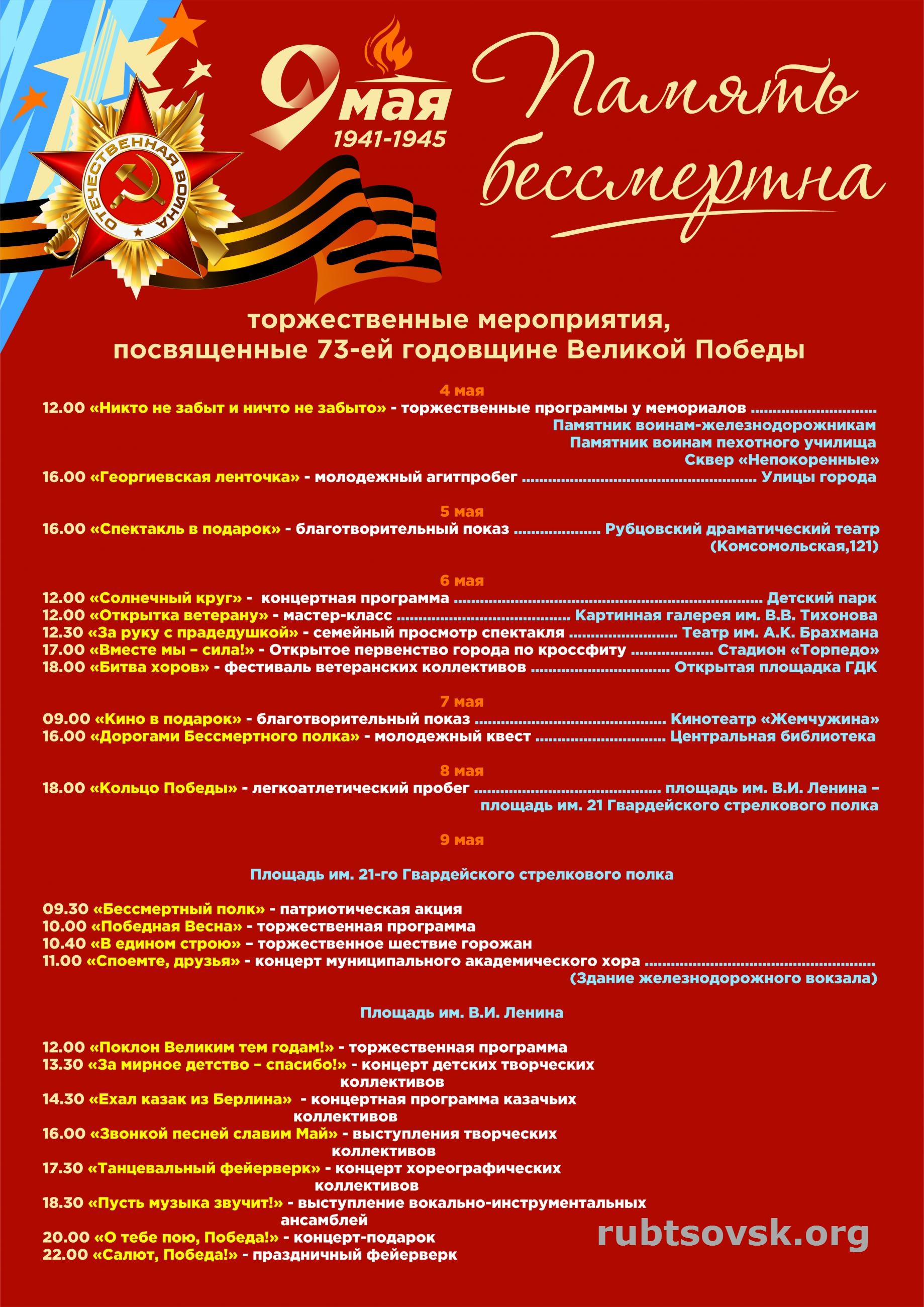 Оргкомитет по подготовке и проведению мероприятий, посвященных 73-й годовщине Победы в Великой Отечественной войне 1941-1945 годов, рекомендует предприятиям, учреждениям города Рубцовска единую концепцию оформления наглядных материалов и иных изображений.