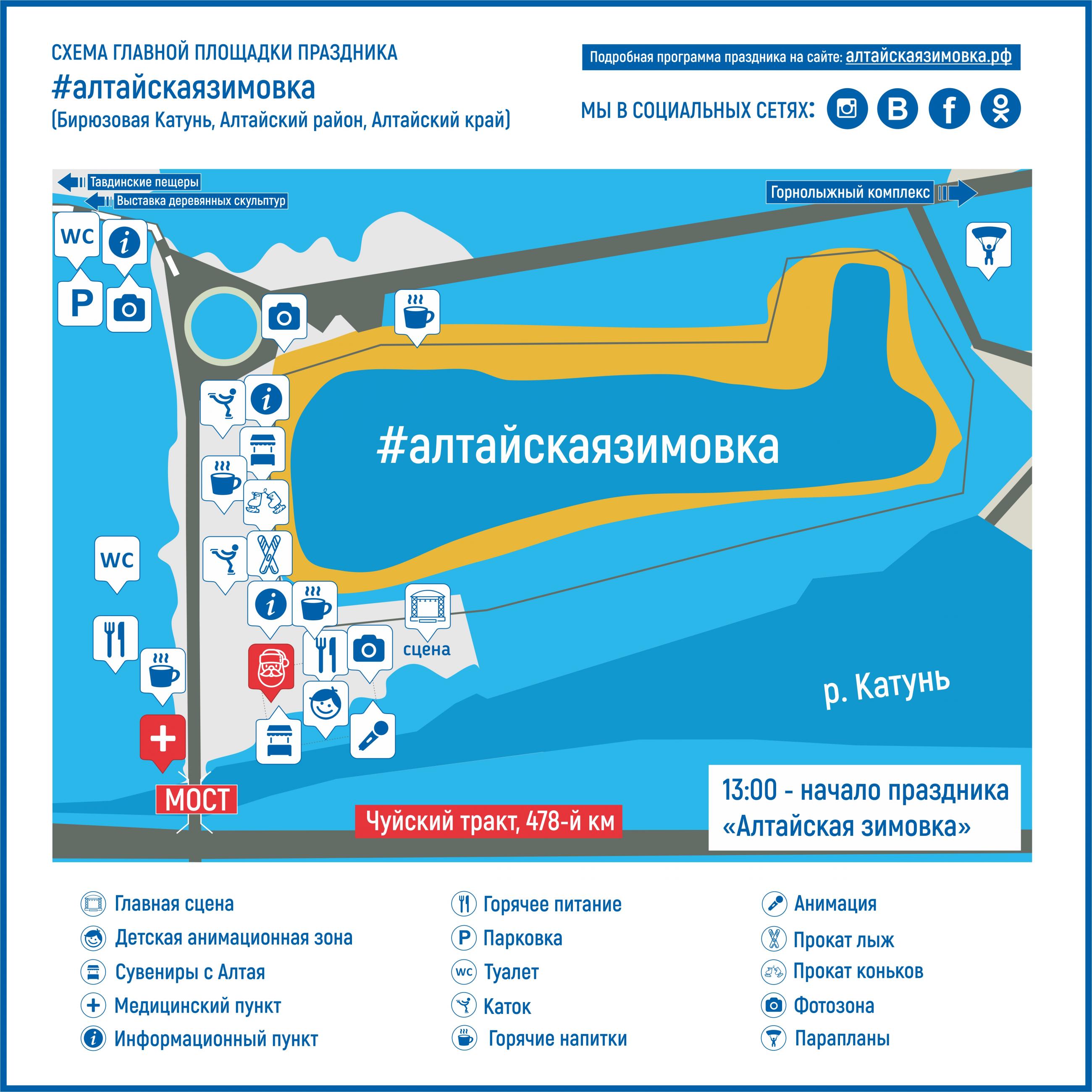 Гости праздника смогут посетить различные точки комплекса «Бирюзовая Катунь», работающие в зимнее время: Тавдинские пещеры, обзорную гору, горнолыжный комплекс, парк деревянных скульптур. По территории будут курсировать бесплатные автобусы.