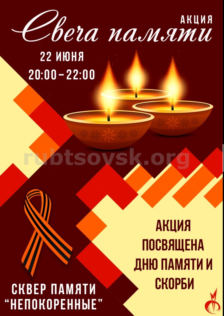 22 июня в 20.00 на площадке мемориального сквера «Непокоренные» состоится гражданская акция «Свеча Памяти». Акция проводится по инициативе молодежной палаты города Рубцовска и предполагает свободное участие всех желающих. Каждый, кто помнит и чтит Великий Подвиг нашего народа, может в течение проведения акции (с 20.00 до 22.00) принести свою свечу и поставить у мемориальной скульптуры, символизирующей боль и страдание безвинных жертв войны.