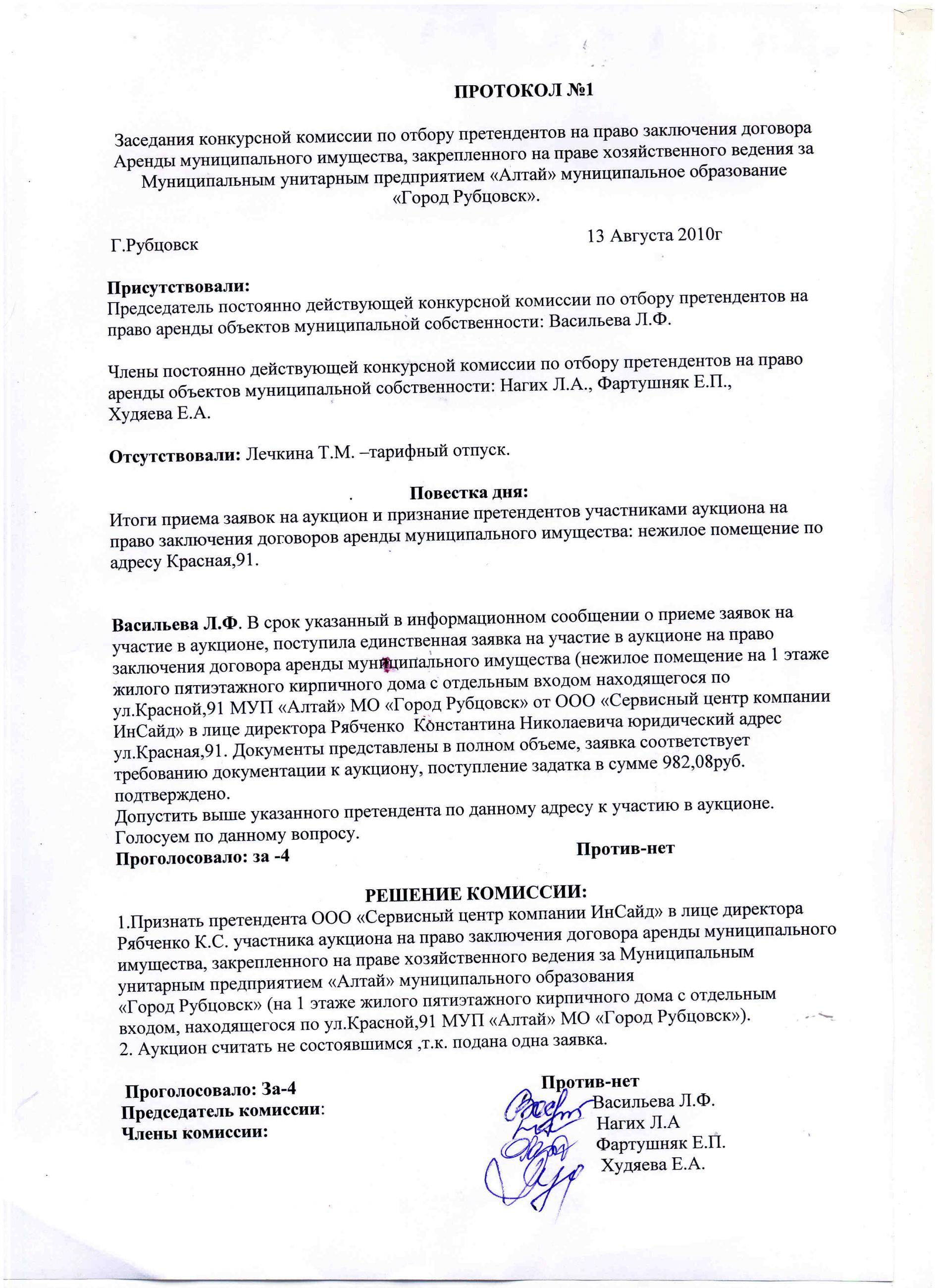 16 Августа 2010 года проведен аукцион на право заключения договора аренды нежилого помещения по ул.Красная, 91, площадью 40,92кв.м. на 1-ом этаже жилого пятиэтажного кирпичного дома с отдельным входом, закрепленного на праве хозяйственного ведения за МУП «Алтай» МО «город Рубцовск».