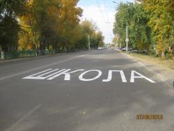 На проезжей части, со стороны учебного заведения автолюбители могут теперь увидеть большие буквы, растянувшиеся на всю полосу и составляющие слово «ШКОЛА».