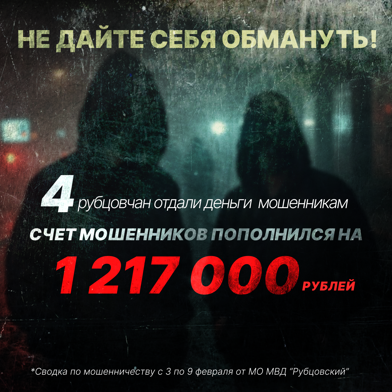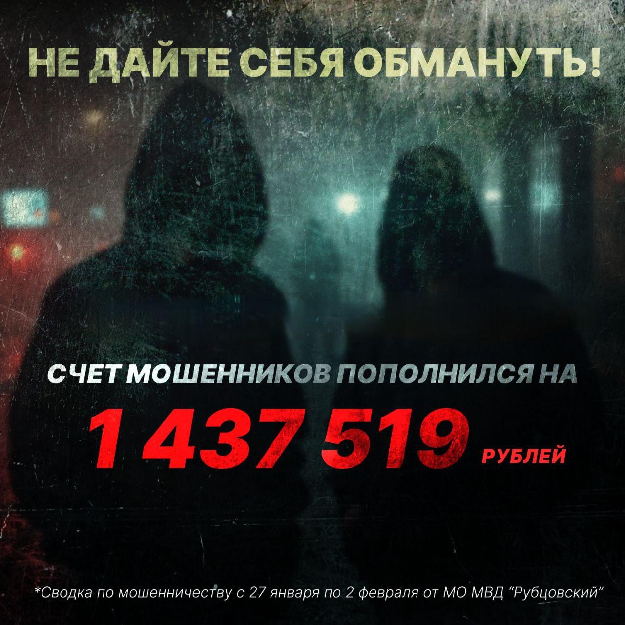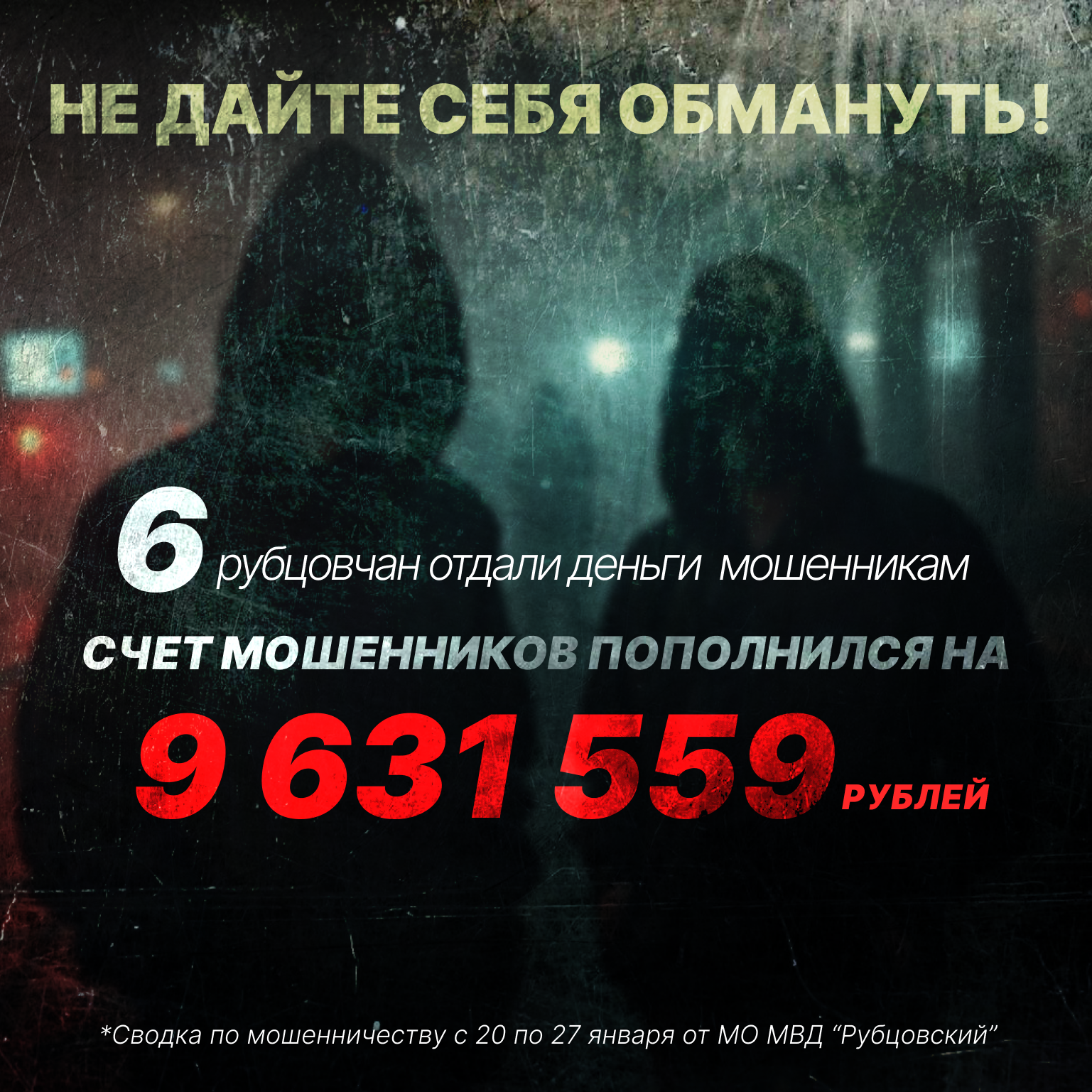 С 20 по 26 января в МО МВД России «Рубцовский» зарегистрированы 6 сообщений о мошенничестве на общую сумму более 9 миллионов рублей. Рубцовчане потеряли: