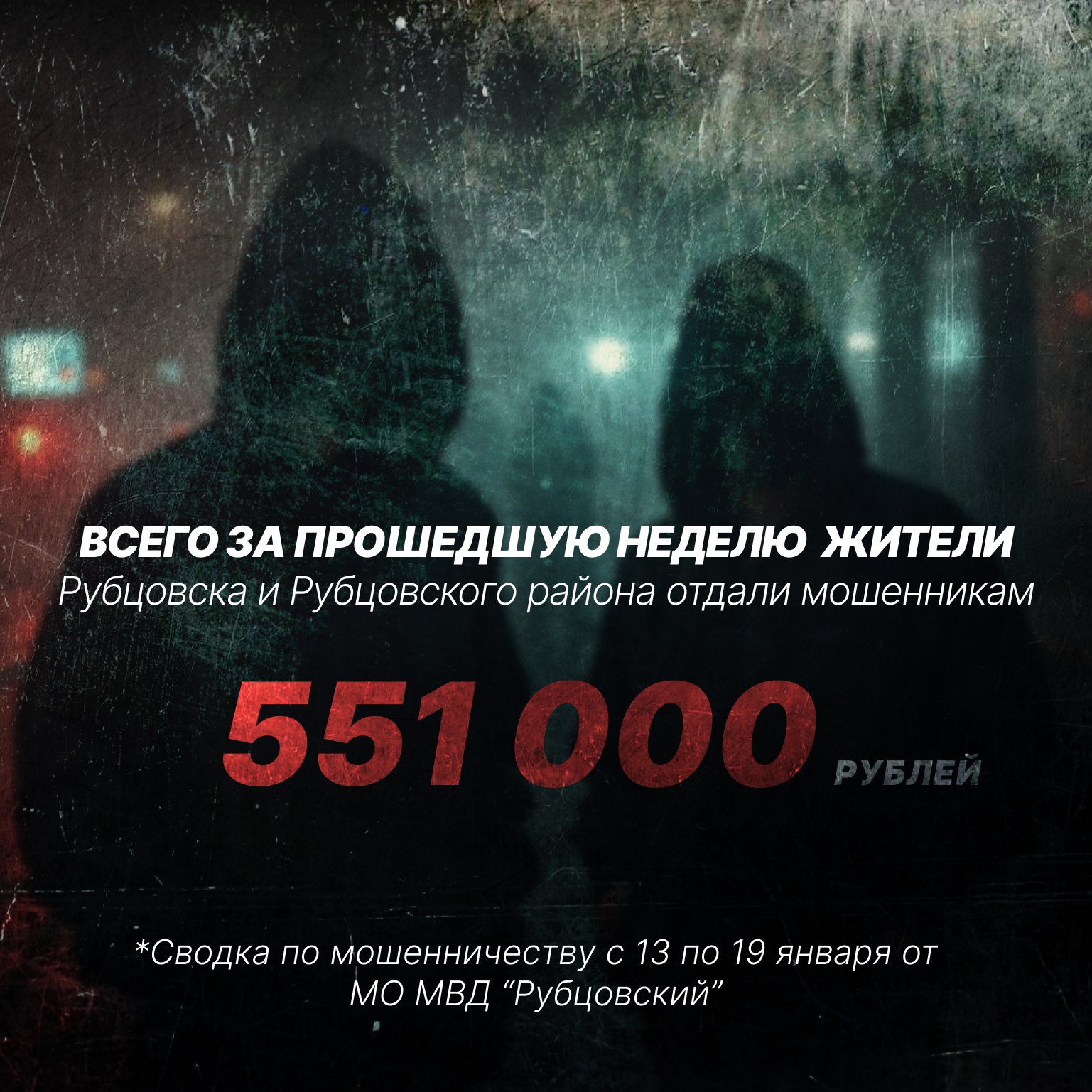 С 13 по 19 января двое жителей Рубцовска и Рубцовского района доверились и отдали мошенникам 340 000 и 211 000 рублей соответственно. Всего за прошедшую неделю в МО МВД России «Рубцовский» были зарегистрированы сообщения о мошенничествах на сумму 551 000 рублей.