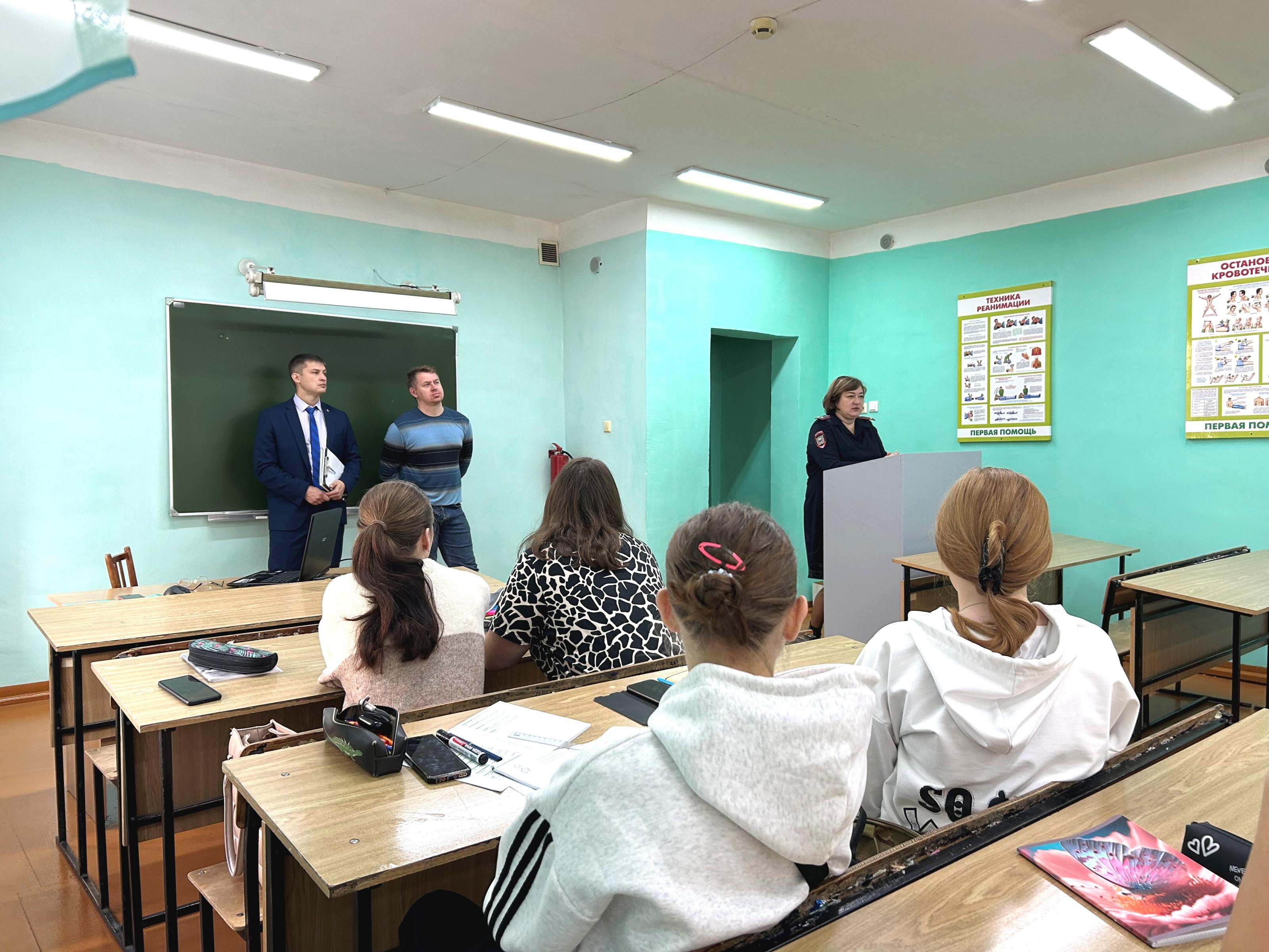 Встретила ребят инспектор группы кадров МО МВД России «Рубцовский» капитан полиции Евгения Тимарова. Она рассказала школьникам о преимуществах службы в полиции, условиях поступления на нее, социальных гарантиях, познакомила их со списком образовательных организаций МВД.