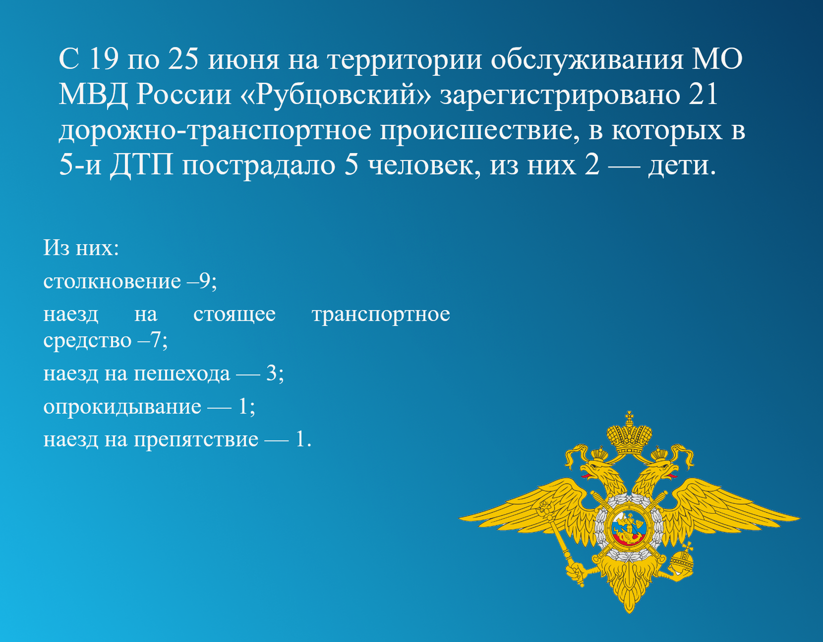 С 12 по 18 июня 2023 года на территории обслуживания МО МВД России «Рубцовский» зарегистрировано 15 дорожно-транспортных происшествий, в которых в 4-х ДТП пострадало 4 человека, из них 2 — дети. Из них: