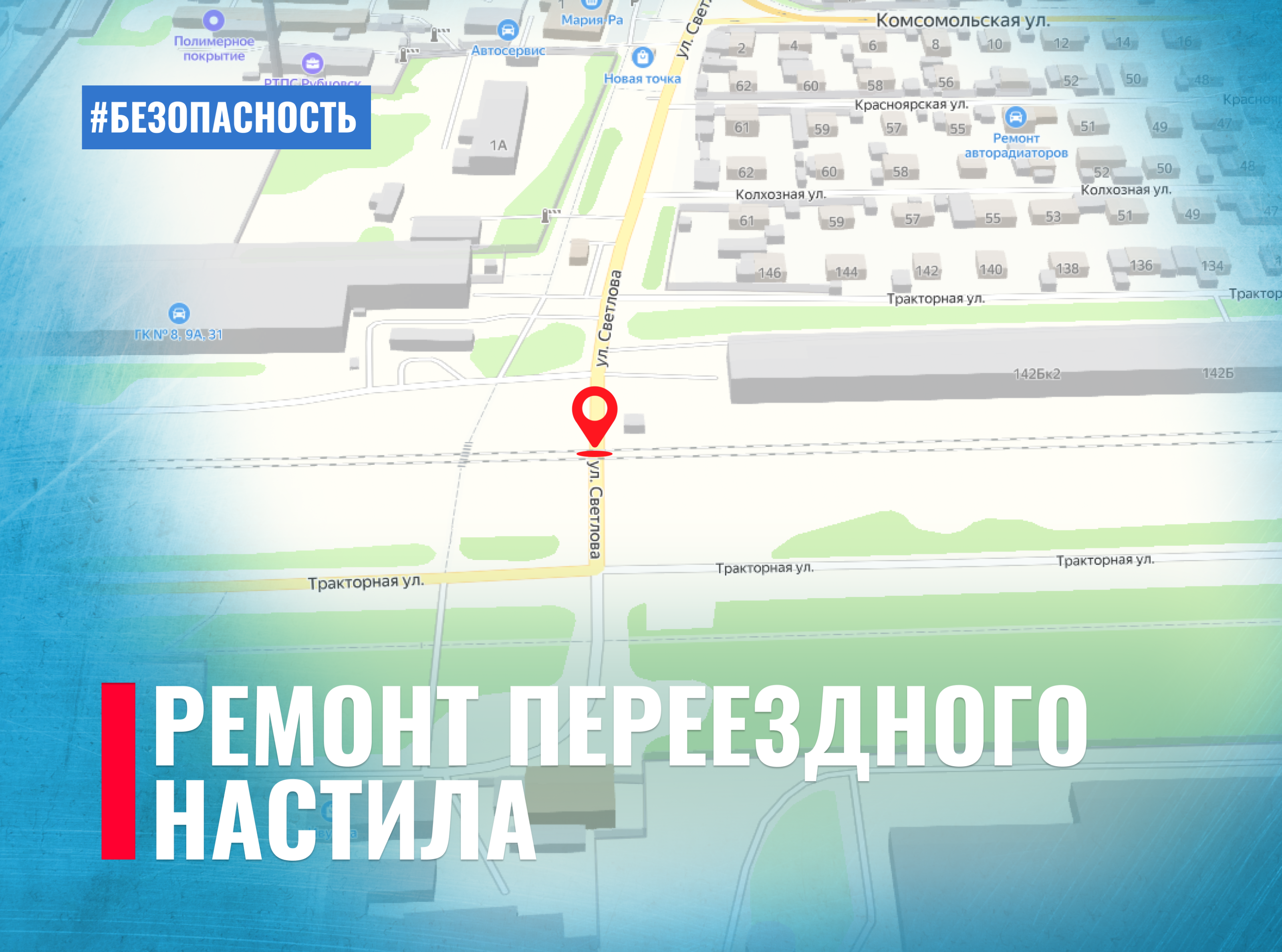 Запланированы работы по ремонту переездного настила железнодорожного переезда 504 км на станции Рубцовск по ул. Светлова. Ремонт будет производиться с движением автотранспорта по одной полосе движения.