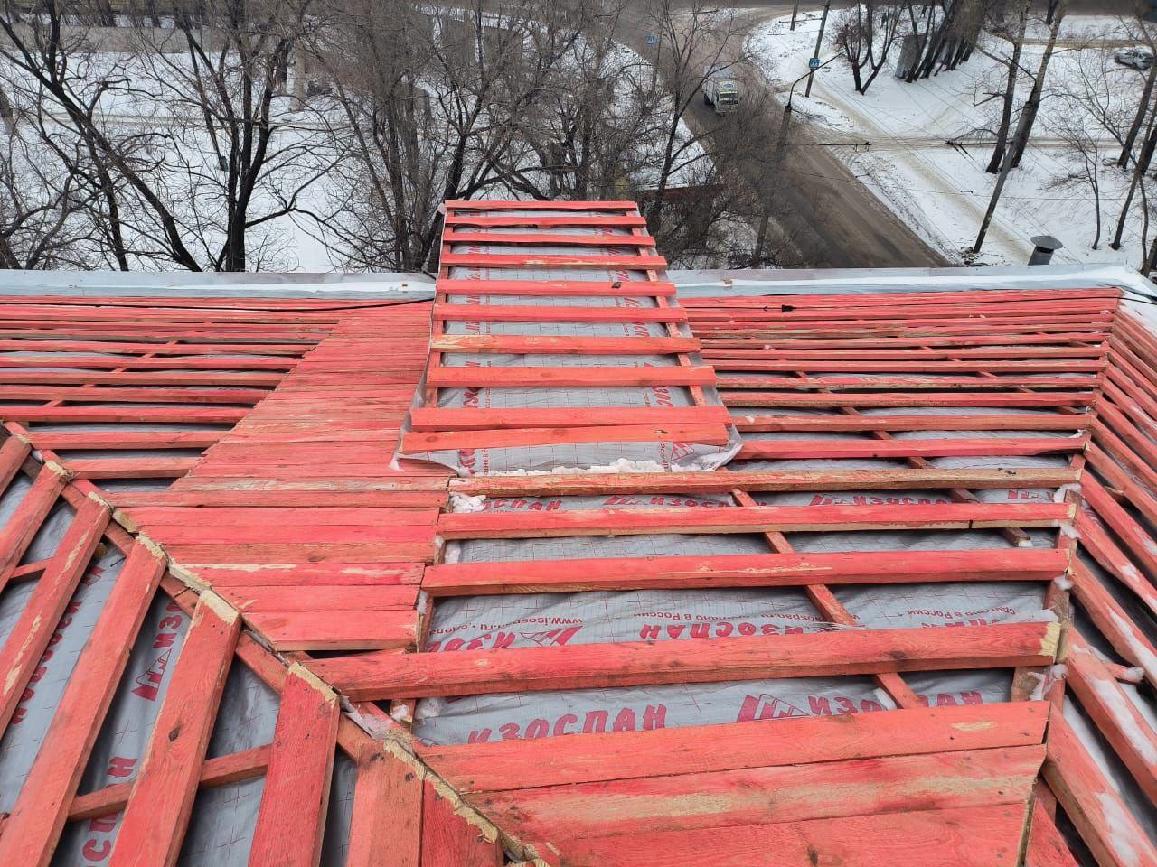 Что сделано за это время? Уже утеплен верхний розлив, произведен демонтаж обрешетки и стропил кровли, а также монтаж стропил и обрешетки, вся крыша затянута изоспаном, а по краям палатками. Для дальнейшего монтажа крыши проведены работы внутри кровли: установлены стропилы, прогоны, мауэрлаты, обработана древесина. Работы по восстановлению крыши по ул. Крылова, 2 будут продолжаться.
