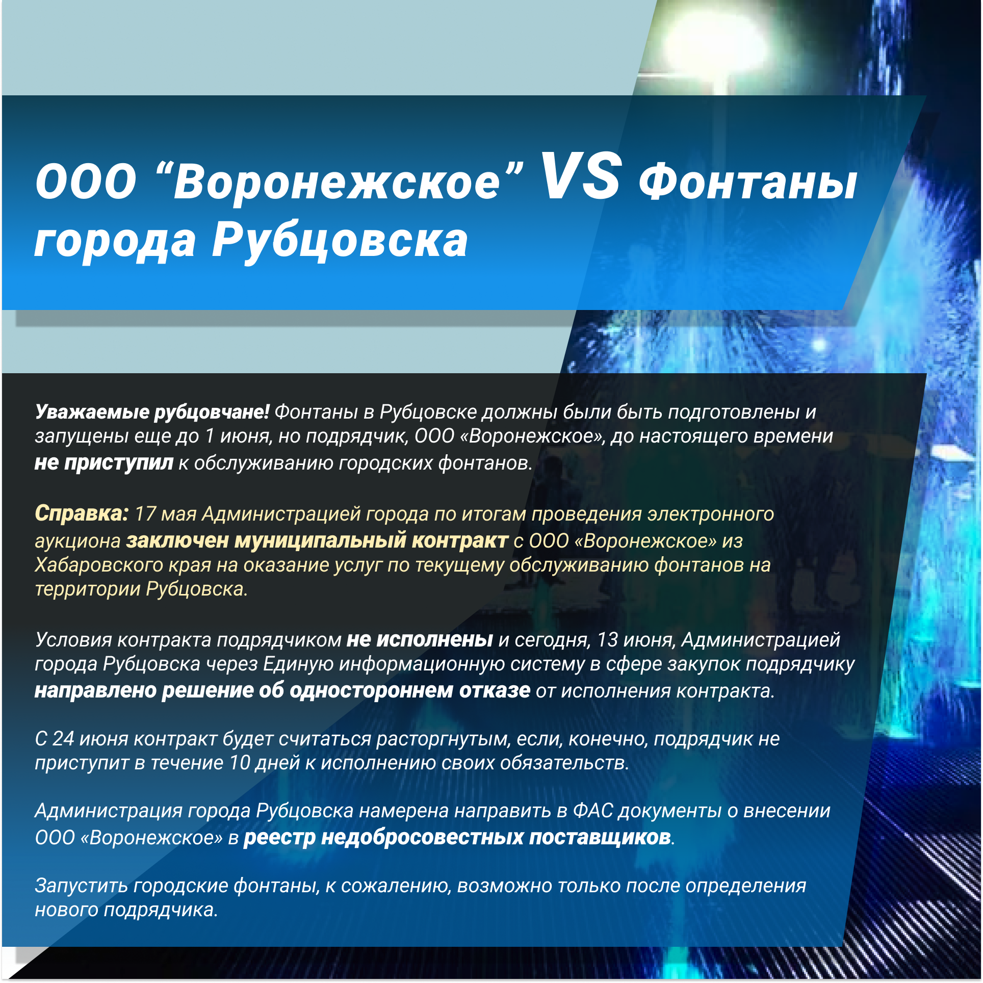 Подрядчика неоднократно уведомляли о том, что нужно приступить к работе в установленный срок. Ему было направлено письмо о том, что до 1 июня он должен расконсервировать и запустить фонтаны Рубцовска. В случае неисполнения данных обязательств Администрация города расторгнет контракт.
