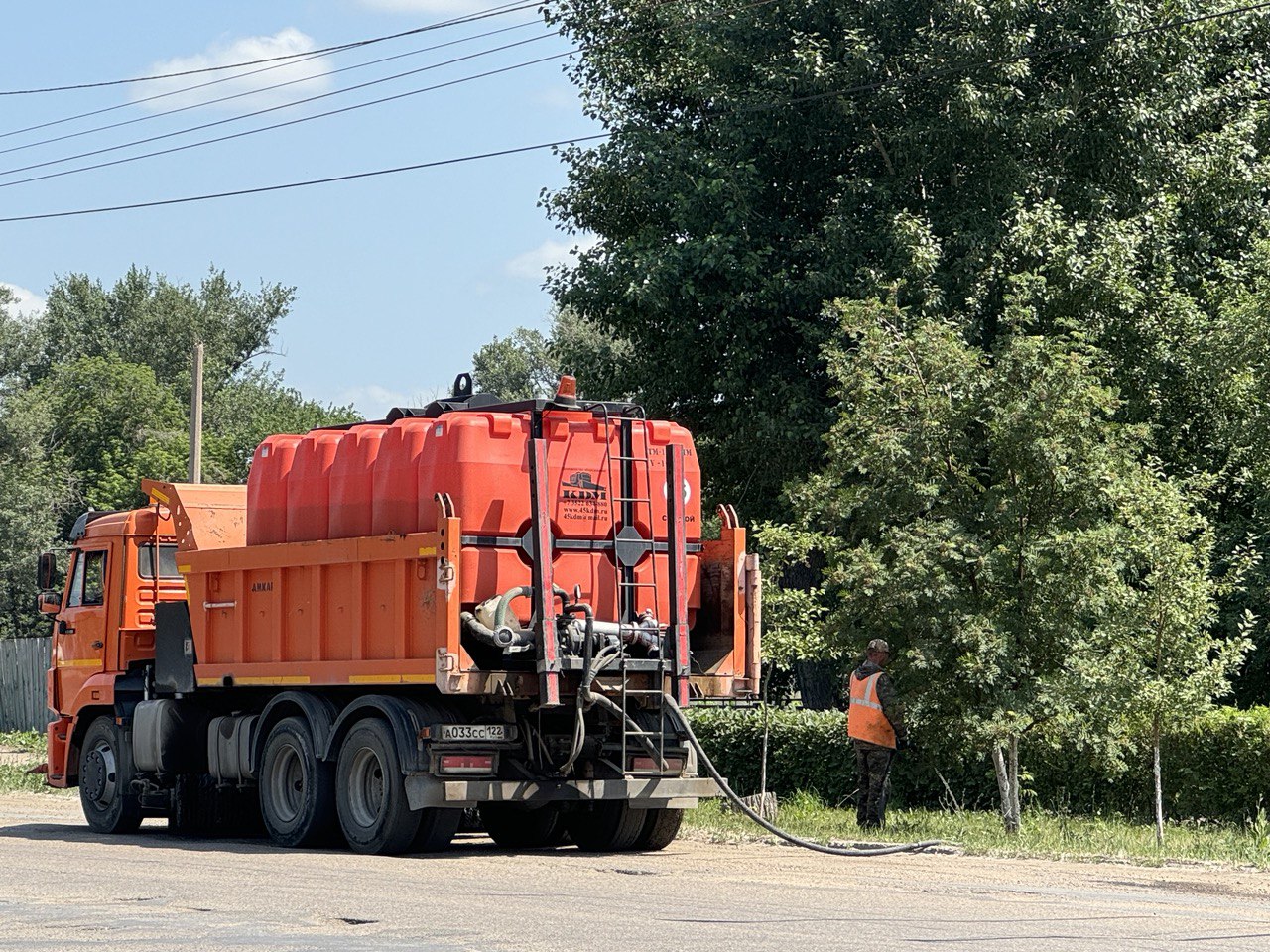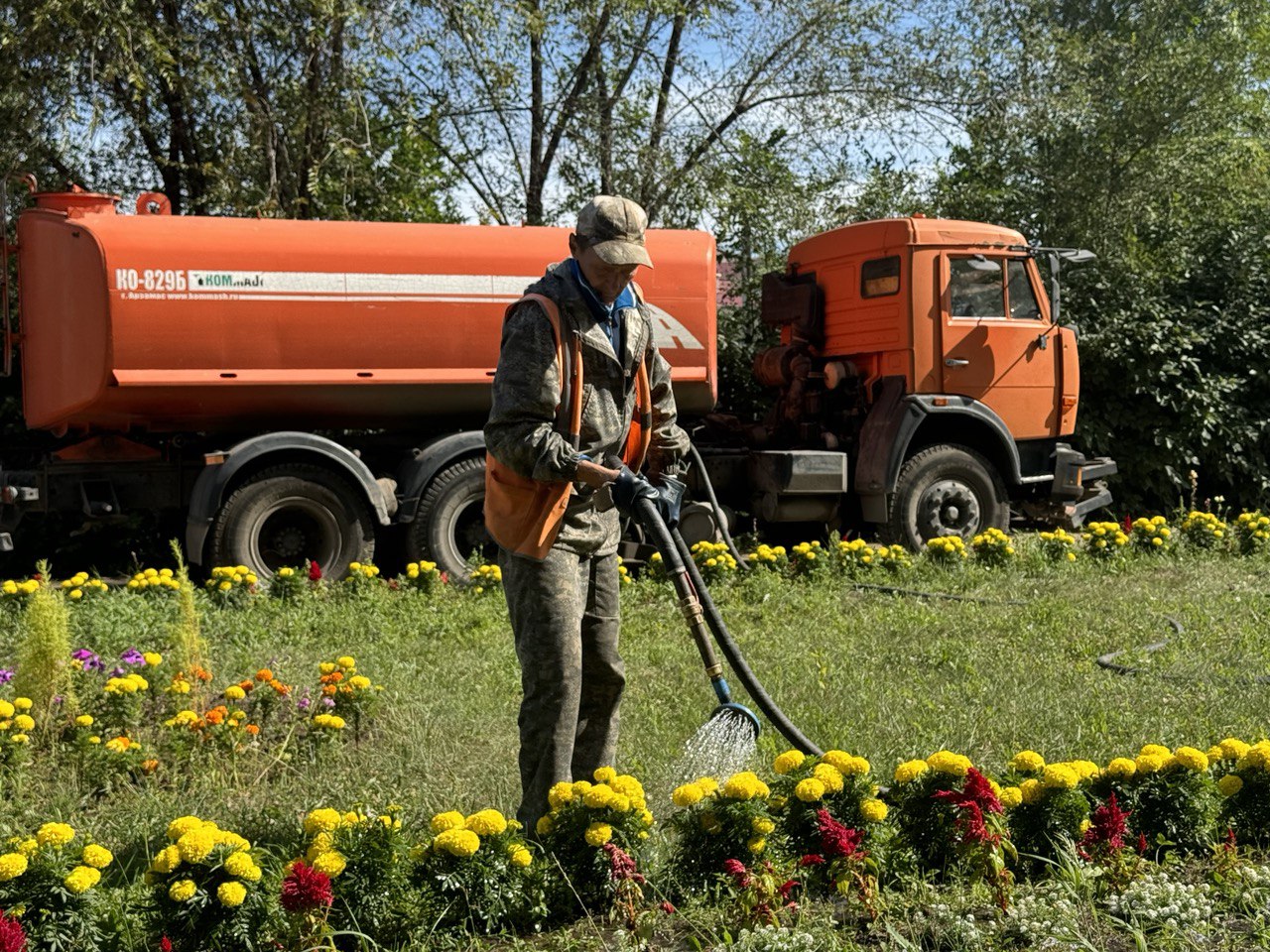 коммунальщики поливают цветы в городских клумбах, а также саженцы деревьев;