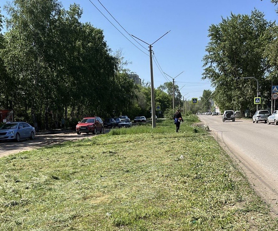 Покос травы проведен на разделительных полосах и обочинах дорог по пр-кту Ленина и ул. Громова, пер. Гражданскому, ул. Светлова, а также в сквере Победы, на площади им. Ленина, набережной им. Петрова, бульваре Победы, ул. Алтайской и ул. Краснознаменской.