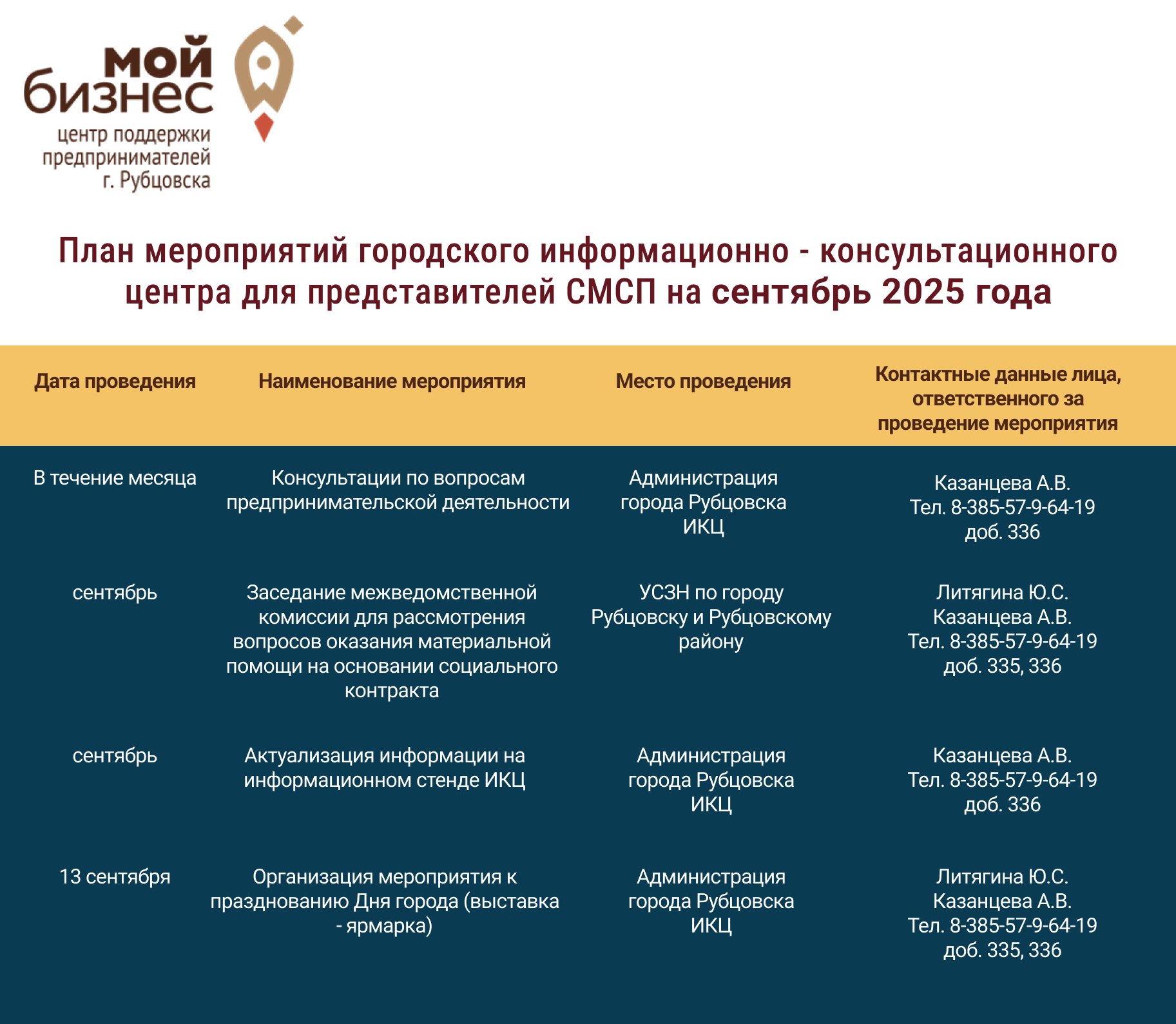 25 сентября 2025 года в городе Рубцовске Центр «Мой бизнес» Алтайского края в рамках реализации национального проекта «Эффективная и конкурентная экономика» приглашает на практикум «Систематизация бизнес-процессов как главный инструмент роста социального бизнеса».