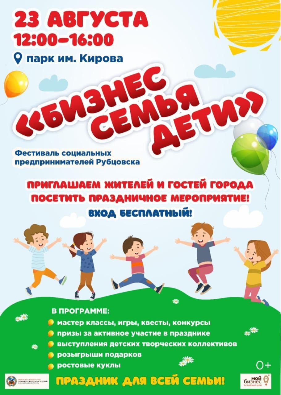 23 августа в городском парке им. С. М. Кирова пройдет семейный праздник «БизнесСемьяДети» в рамках фестиваля социальных предпринимателей Рубцовска.