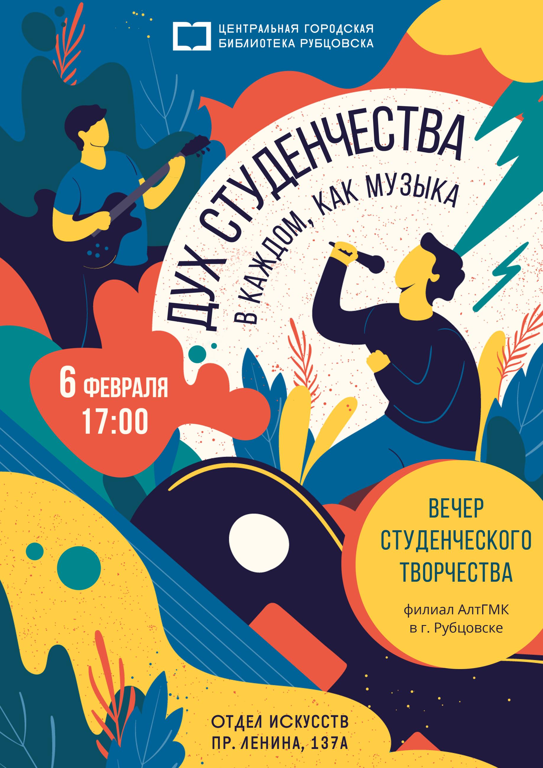 6 февраля в 17:00 в Центральной городской библиотеке пройдет концерт «Дух студенчества в каждом, как музыка». Концерт организован активными и талантливыми студентами филиала Алтайского государственного музыкального колледжа в Рубцовске.