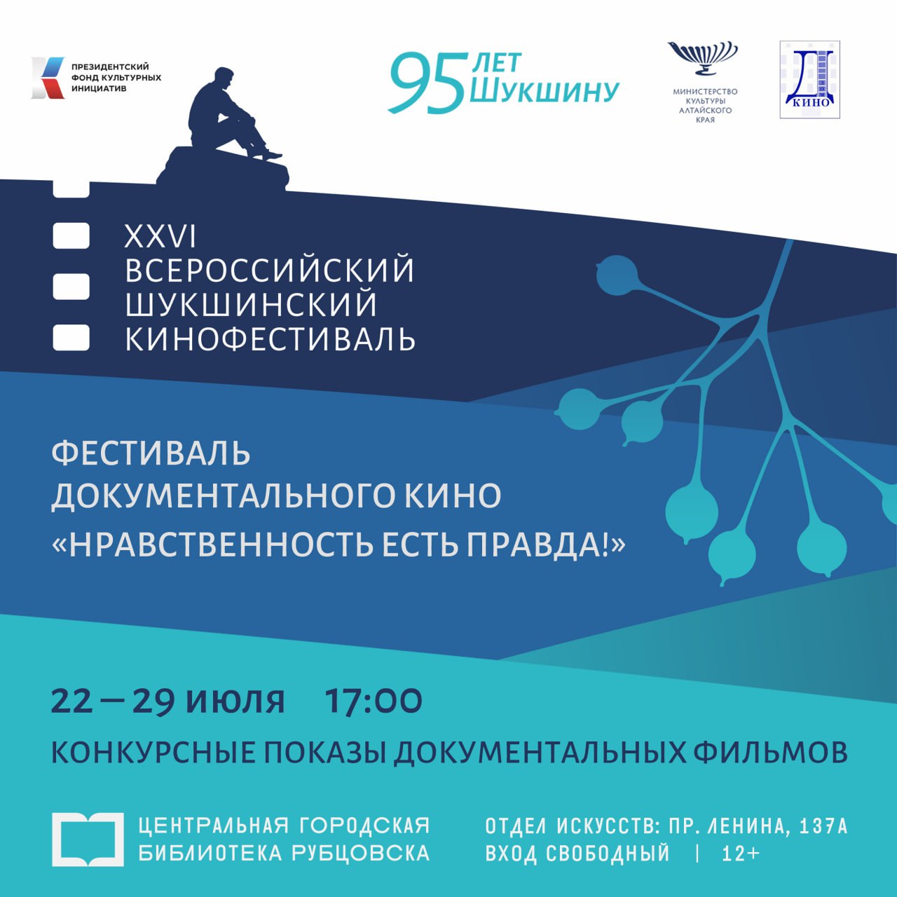 29, 30.07 – 17:00 «XXVI Всероссийский Шукшинский кинофестиваль» – конкурсные показы документальных фильмов (16+) Центральная городская библиотека