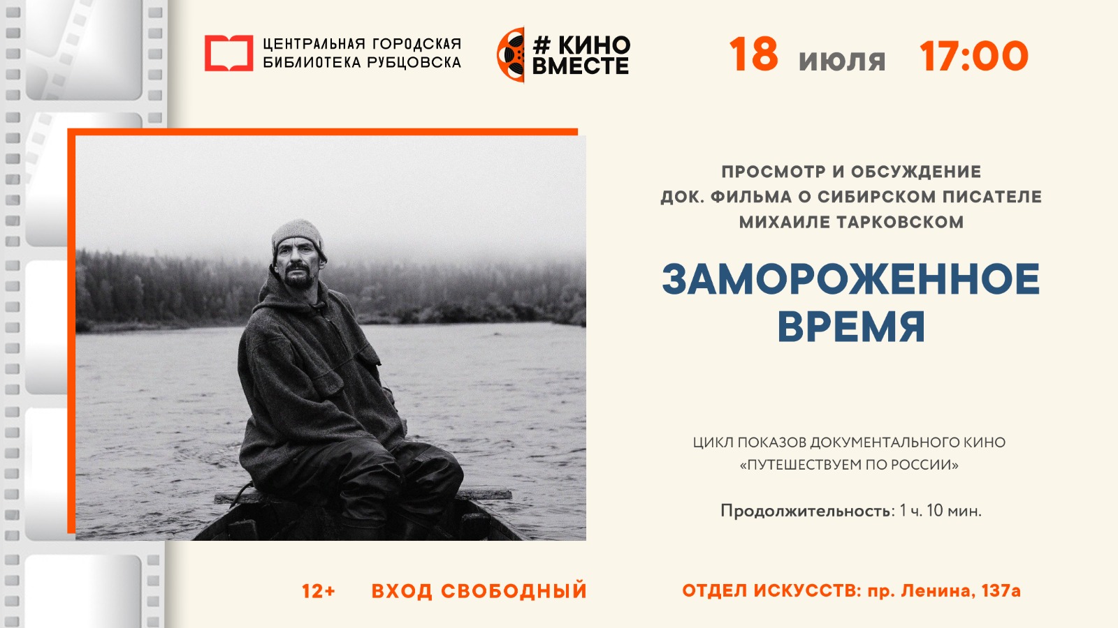 Накануне визита, 18 июля в 17:00 приглашаем рубцовчан и гостей города на просмотр документального фильма «Замороженное время» о жизни коренного москвича Михаила Тарковского, который уже более 30 лет живёт и работает в сибирской глубинке. Это фильм о величественном Енисее, о Сибири, о настоящих сибиряках и об ощущении этой земли как единого материка, неделимого во времени и пространстве, и о том, какими нитями он связан со всей остальной Россией. Невероятные по своей красоте пейзажи сибирской реки в этом фильме играют свои роли, а Енисей пишет для них сценарии.