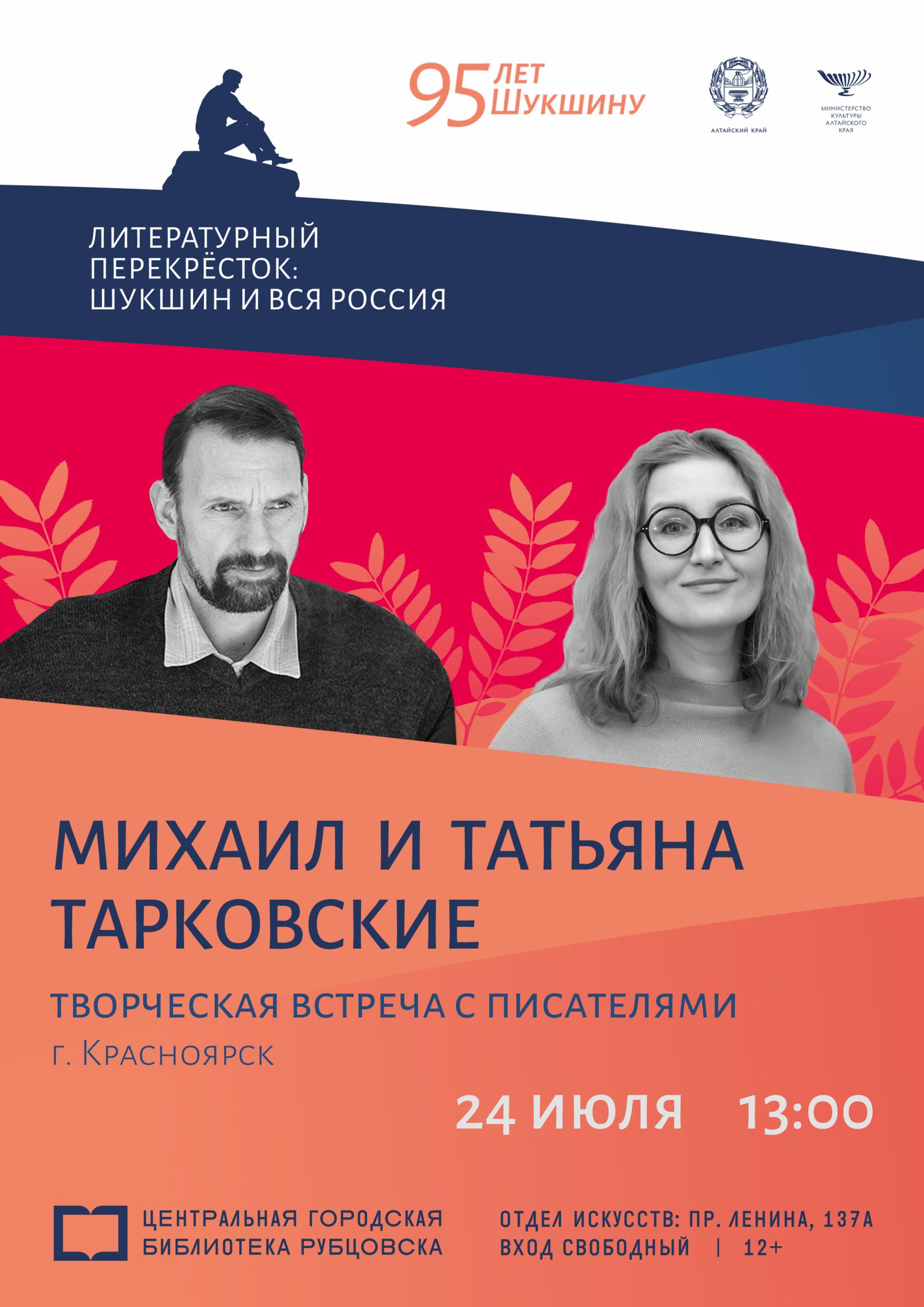 24.07 – 13:00 «Литературный перекрёсток: Шукшин и вся Россия» – творческая встреча с писателями Михаилом и Татьяной Тарковскими (г. Красноярск) (12+) Центральная городская библиотека