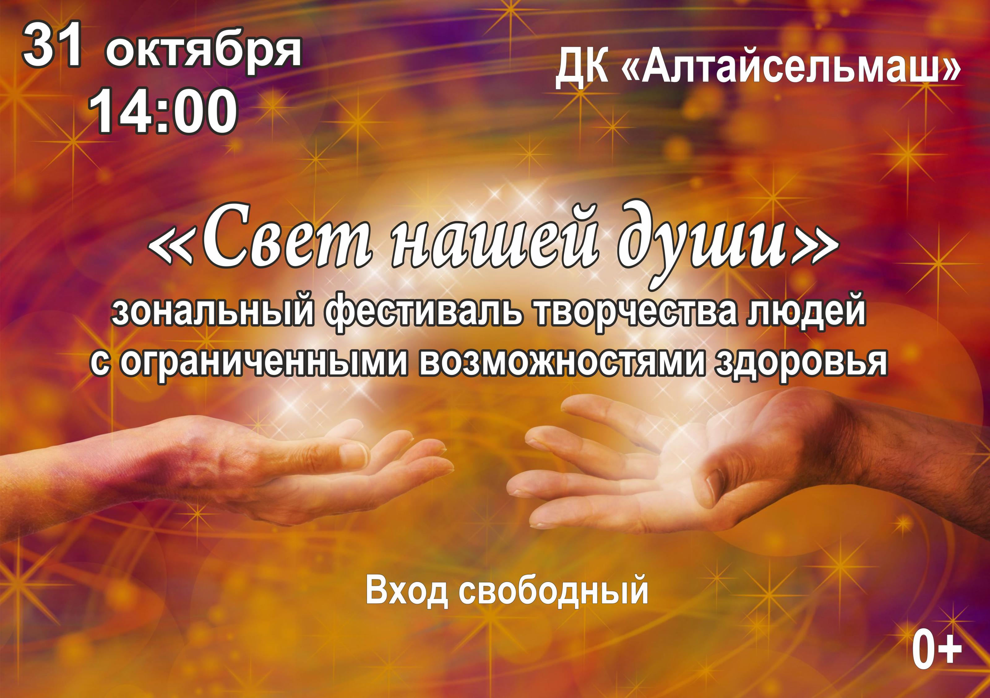 31 октября в 14:00 в ДК «Алтайсельмаш» состоится конкурс-концерт «Свет нашей души», посвященный творчеству людей с ограниченными возможностями здоровья. Тематика фестиваля: «Родина в сердце моем!». Возраст участников: от 16 лет.