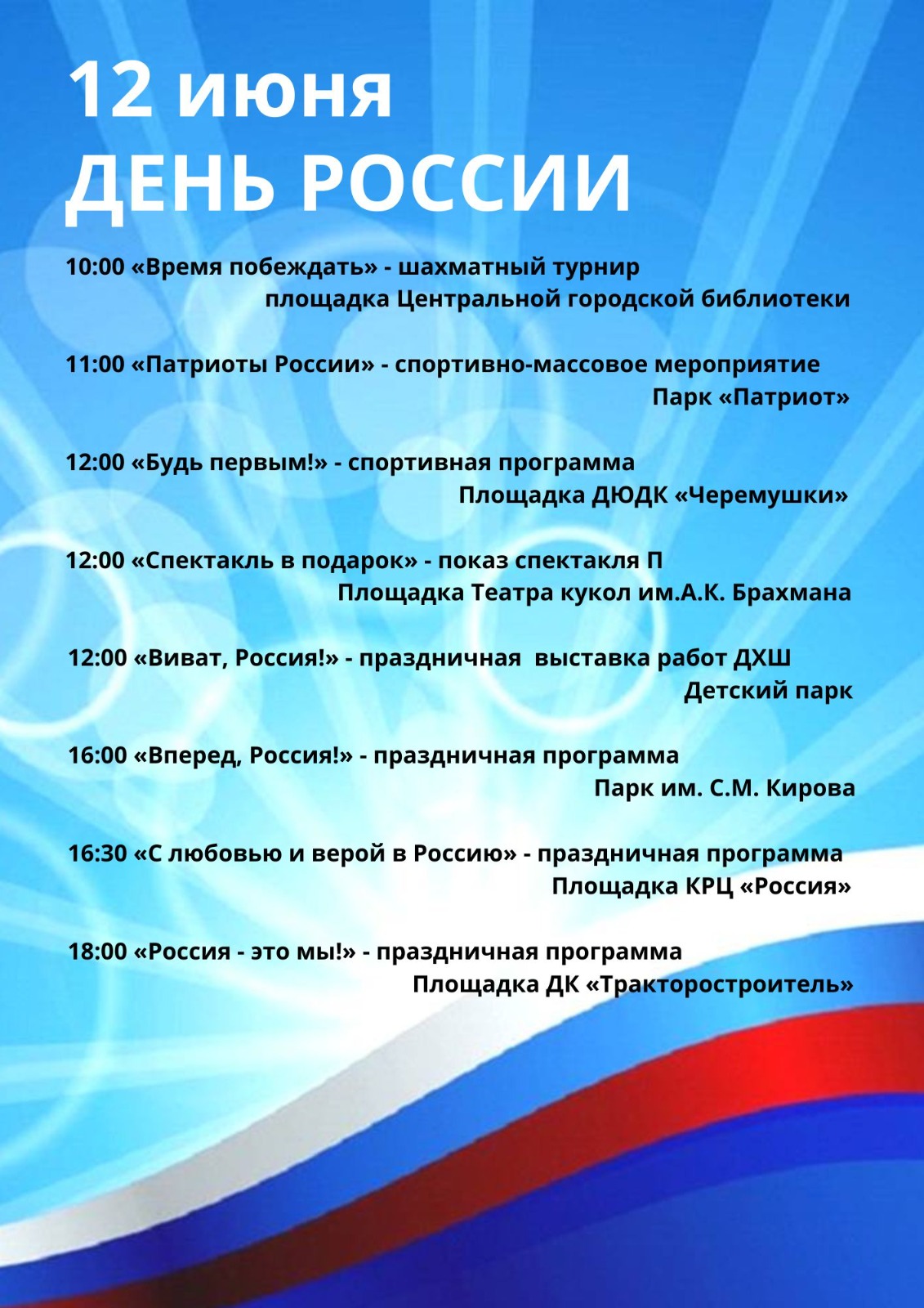 12.06 - 18:00 «Россия - это мы» - праздничная программа, посвященная Дню России (0+) площадка ДК «Тракторостроитель»