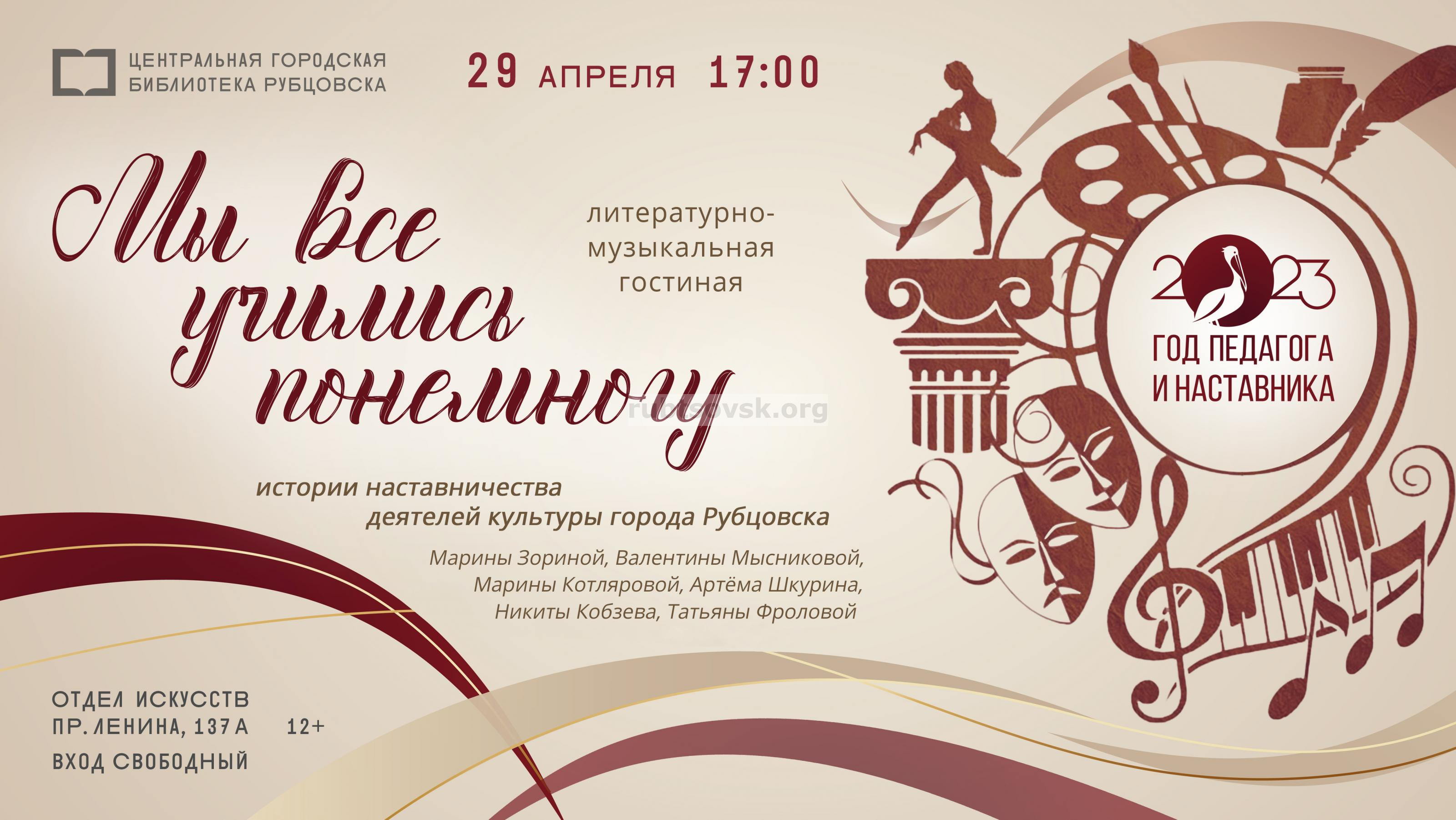Апрельский вечер в литературно-музыкальной гостиной посвящается деятелям культуры города Рубцовска, которые расскажут о своих наставниках, повлиявших на выбор, первые шаги и достижения в профессии.