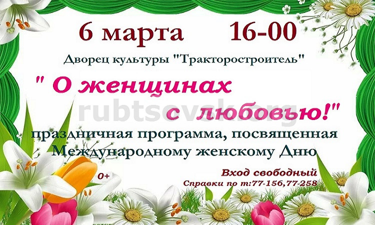 06.03 – 16:00 «О женщинах с любовью!» – городская праздничная программа, посвященная Международному женскому Дню (0+) «ДК «Тракторостроитель»