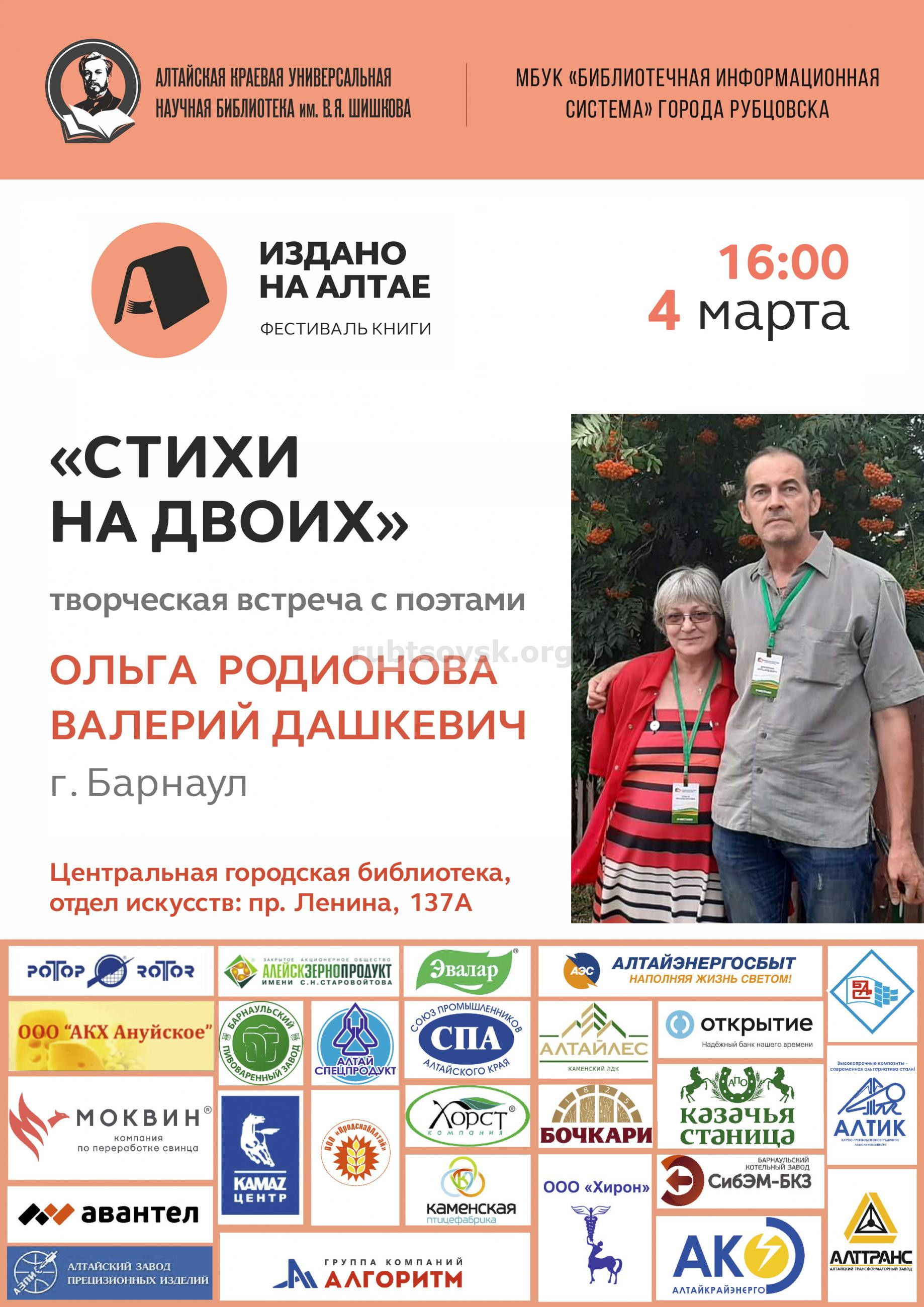 4 марта в 16 часов Центральная городская библиотека, в рамках фестиваля "Издано на Алтае", приглашает рубцовчан на творческую встречу с поэтами Ольгой Родионовой и Валерием Дашкевичем (г. Барнаул).