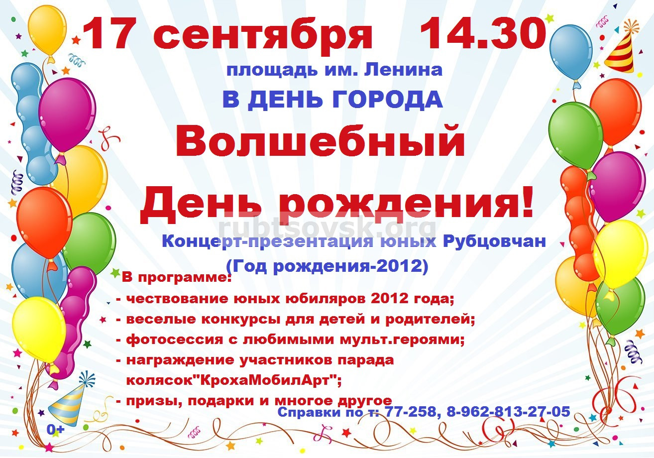 Одним из творческих подарков для маленьких рубцовчан и их родителей станет чествование юных юбиляров, которые отмечают в 2022 году свое 10-летие. 17 сентября в 14.30 на площади имени Ленина состоится концерт-презентация «Год рождения - 2012!».