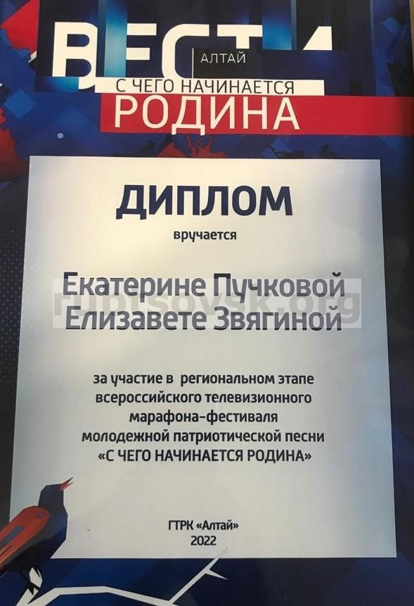 Дуэт воспитанниц студии "НоТА" Елизаветы Звягиной и Екатерины Пучковой хорошо известен не только рубцовчанам, но и всем, кто следит за развитием музыкальной культуры Алтайского края. Клип "За тебя, Родина-мать" дуэта "НоТы" вошел в тройку лучших клипов Марафона молодёжной патриотической песни «С чего начинается Родина». https://vesti22.tv/news/smotrite-kto-vystupil-ot-altayskogo-kraya-vo-vse...