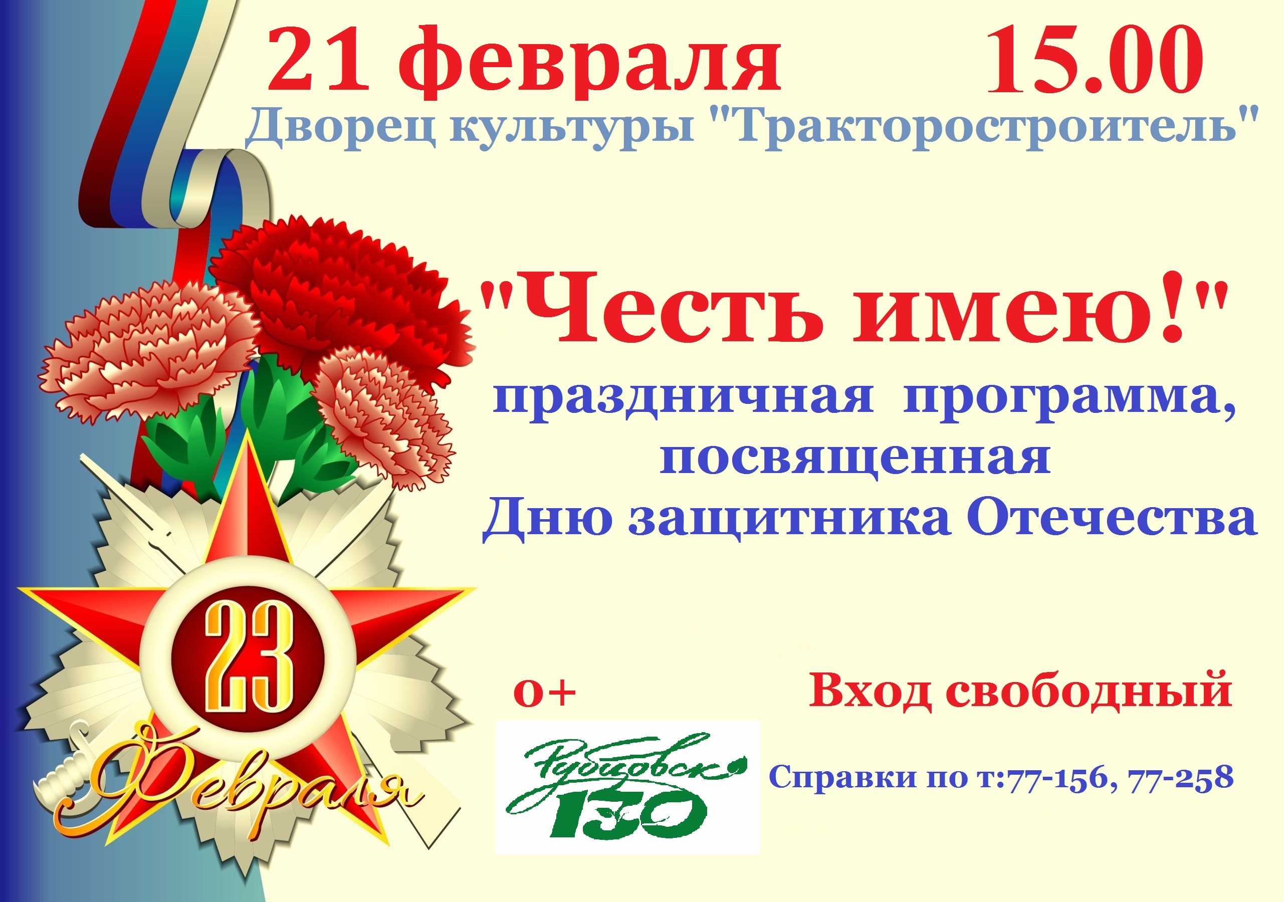 День защитника Отечества традиционно считается праздником мужества доблести и чести, днем чествования мужчин, которые испокон веков были защитниками не только своего дома, но и своей земли, Родины. 21 февраля в 15.00 на сцене Дворца культуры «Тракторостроитель» состоится праздничная программа "ЧЕСТЬ ИМЕЮ", посвященная этому знаменательному дню. Со сцены будут звучать слова благодарности и признательности офицерам и солдатам Российской Армии, уволенным в запас военнослужащим, ветеранам Великой Отечественной войны, ветеранам локальных войн, а также будущим защитникам нашей Родины. Для всех почетных гостей праздничного мероприятия свои музыкальные поздравления подарят творческие коллективы города.