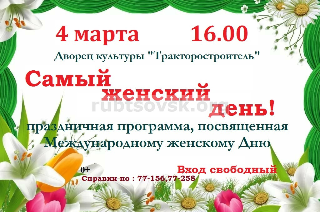 4 марта в 16.00 Дворец культуры «Тракторостроитель» приглашает на городскую праздничную программу, посвященную Международному женскому дню.