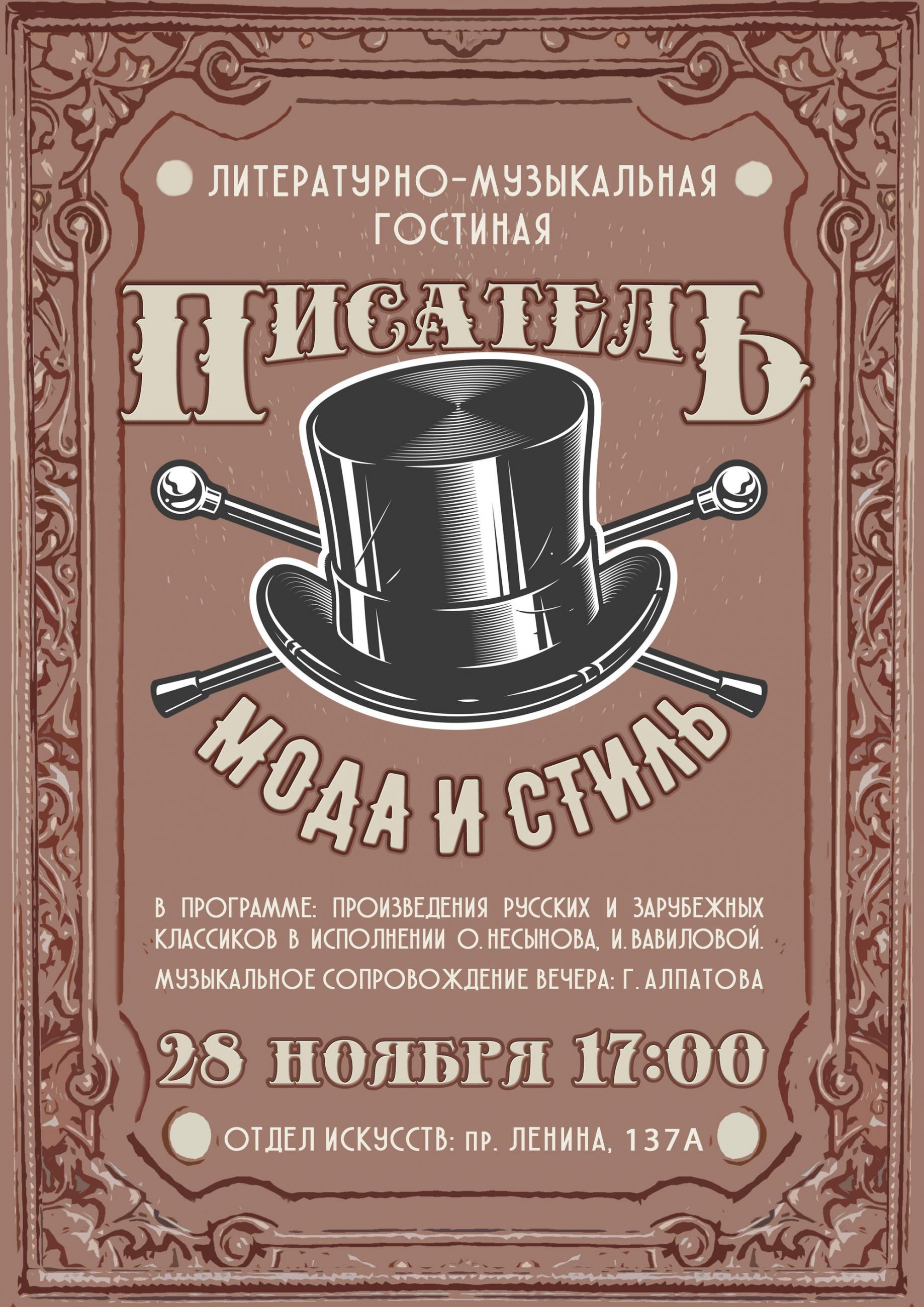 В великих произведениях литературы нет ничего случайного. Все в них имеет смысловую нагрузку: пейзаж, предметы быта и, несомненно, костюмы героев. А что же сами поэты и писатели? Существуют ли у них какие-то законы моды для выражения своего творческого начала, или каждая из этих личностей прибегала к своим методам? Да, многие литераторы умели показать даже во внешнем виде свою принадлежность к творческим натурам! И для поклонников запоминающийся стиль поэта или писателя становится частью самого литератора. На вечере прозвучат отрывки из произведений русских и зарубежных классиков в исполнении Олега Несынова, Инги Вавиловой. Музыкальное сопровождение вечера – Галина Алпатова.