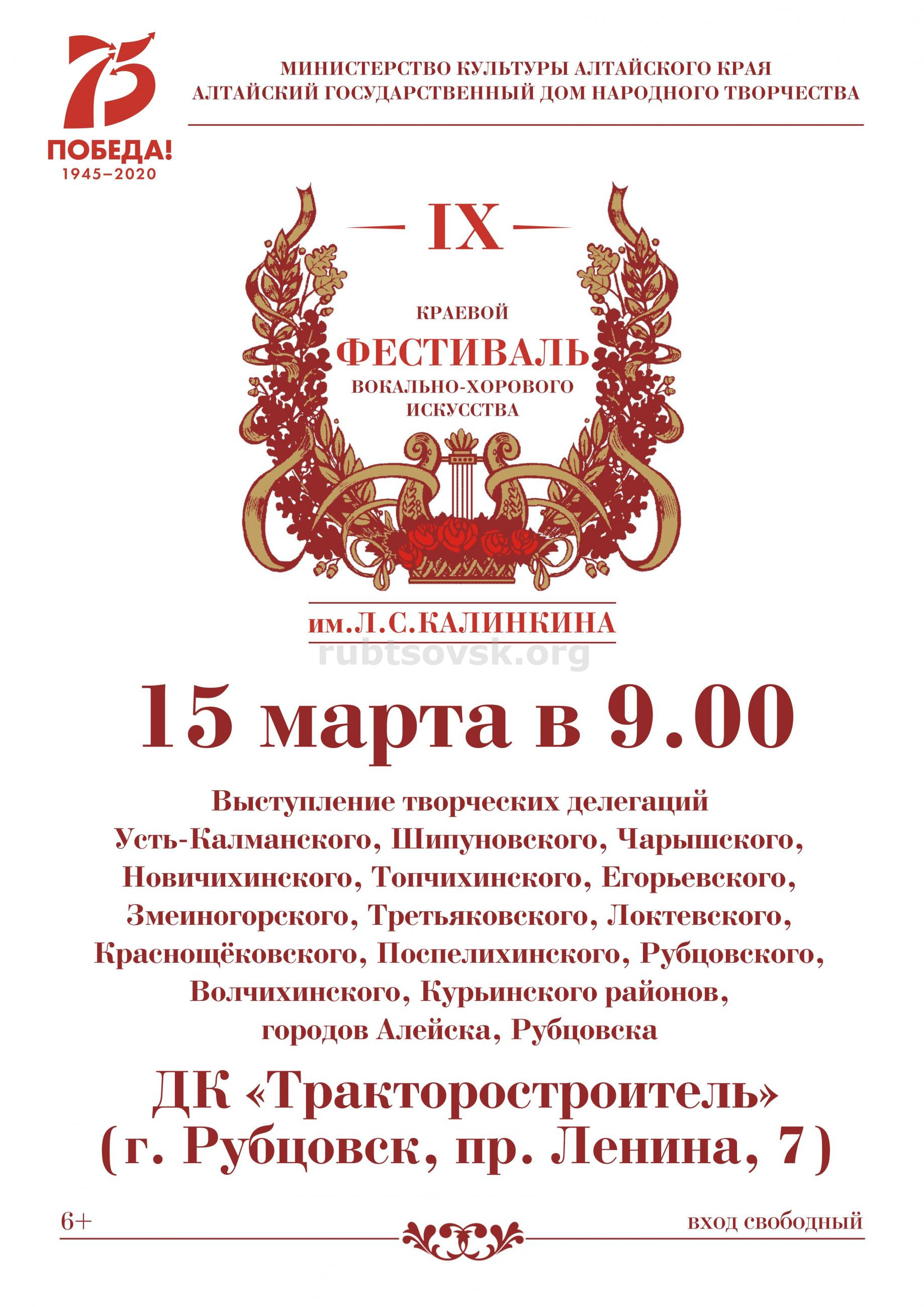 В Год памяти и славы, в год празднования 75-летия Победы в Великой Отечественной войне 1941-1945 годов в Алтайском крае проводится IX краевой фестиваль вокально-хорового искусства имени Леонида Степановича Калинкина. Девиз фестиваля: «Помнит сердце, не забудет никогда!..». Масштабный вокально-хоровой форум берёт своё начало в г. Рубцовске 15 марта 2020 года. Во Дворце культуры «Тракторостроитель» (ул. Ленина,7) выступят около 60 певческих коллективов и солистов из Третьяковского, Змеиногорского, Курьинского, Краснощёковского, Локтевского, Поспелихинского, Рубцовского, Новичихинского, Волчихинского, Егорьевского, Шипуновского, Топчихинского, Усть-Калманского районов, г. Рубцовска. Общее количество участников – более 500 человек. Начало фестиваля в г. Рубцовске в 9.00.