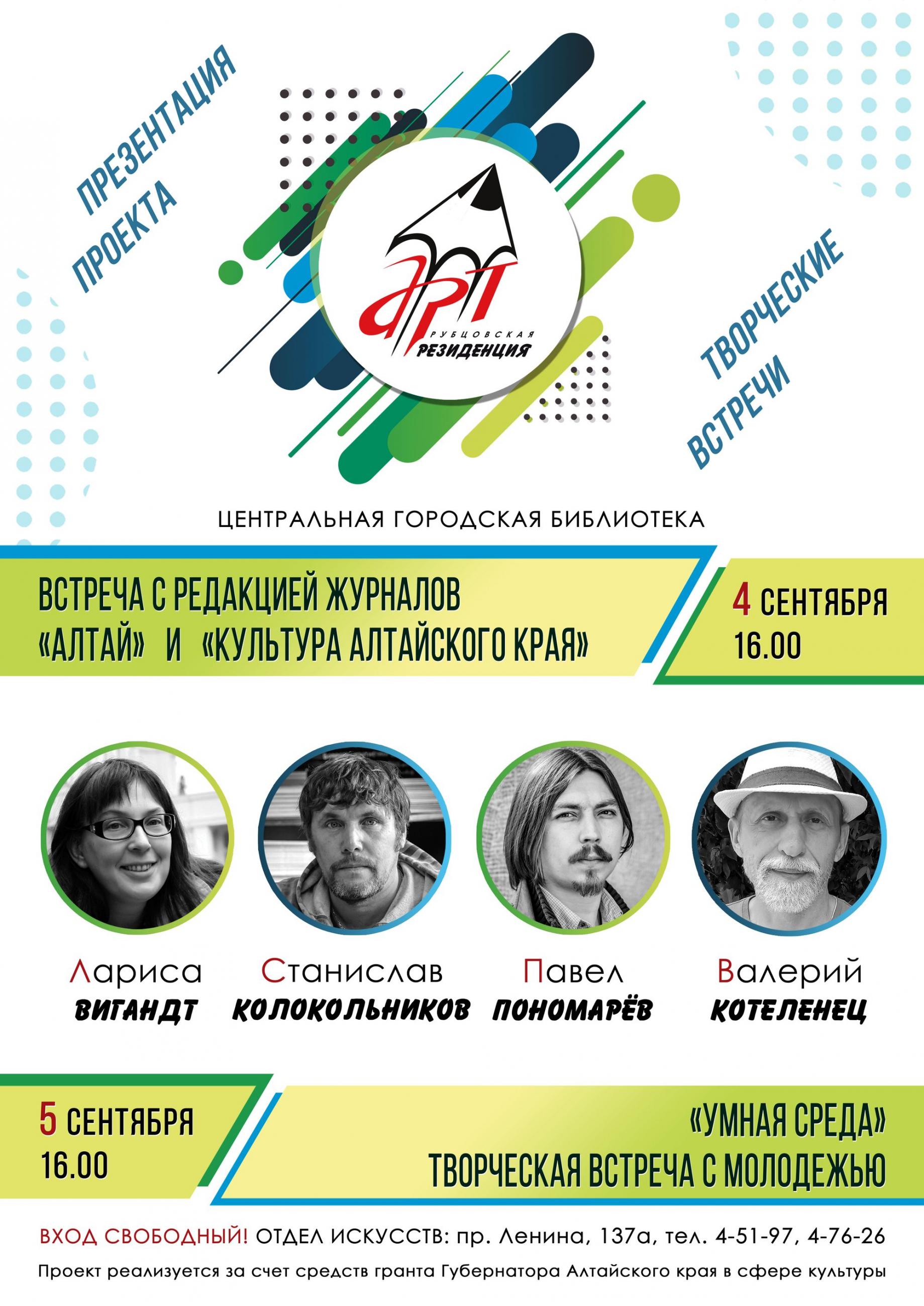 "Рубцовская арт-резиденция" 4 и 5 сентября в отделе искусств центральной городской библиотеки состоится презентация проекта «Рубцовская арт-резиденция». 4 сентября в 16.00 состоится встреча с редакцией журналов «Алтай» и «Культура Алтайского края»: главным редактором Ларисой Александровной Вигандт, писателями и поэтами Валерием Котеленцем, Павлом Пономаревым, Станиславом Колокольниковым. 5 сентября в 16.00 – «Умная среда»: творческая встреча этих авторов с молодежью города.