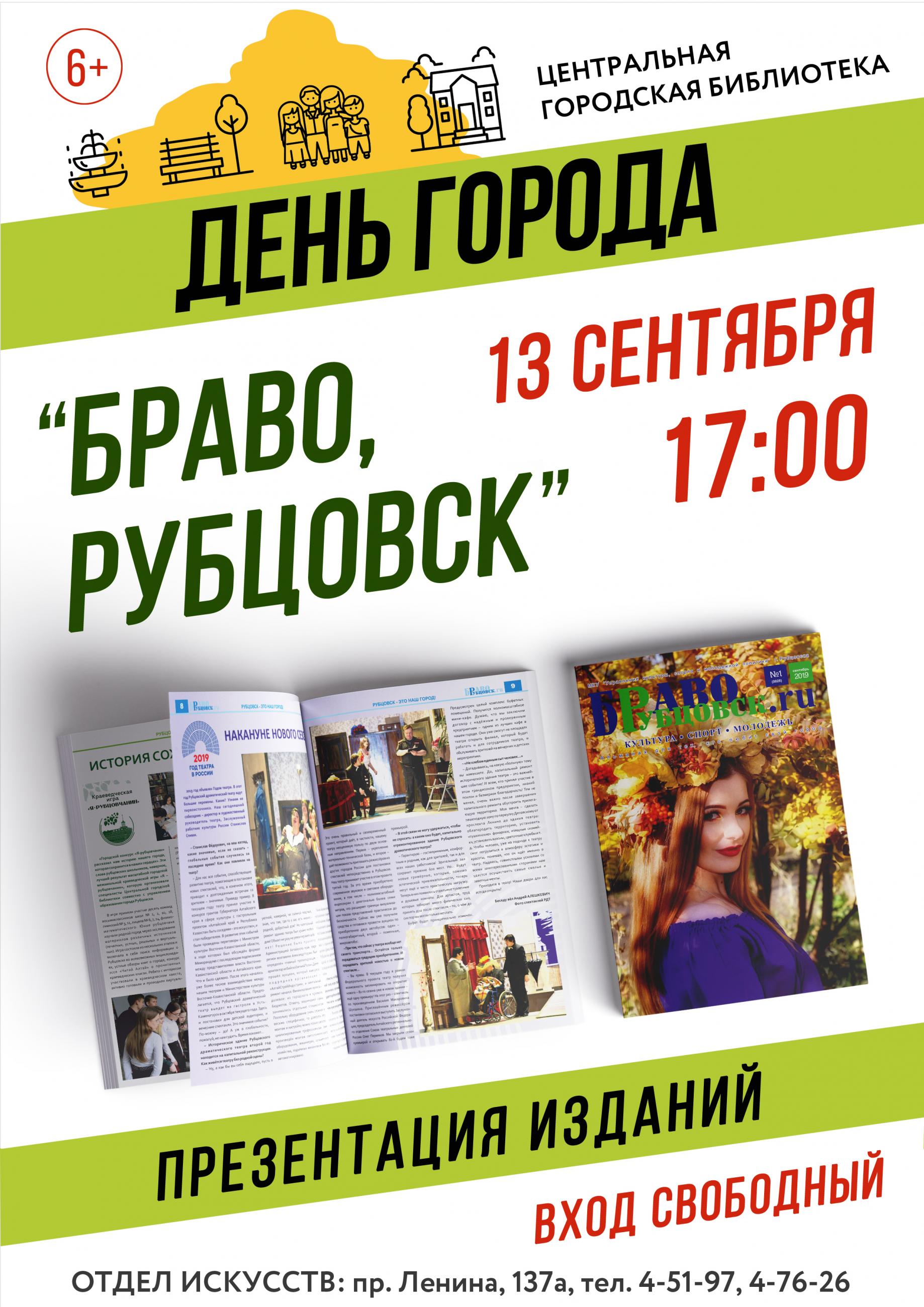 13 сентября в 17 часов в отделе искусств центральной библиотеки состоится презентация двух изданий: журнала «БравоРубцовск.ru» и фотокалендаря «Нить памяти незримо нас связала». По традиции на страницах журнала опубликованы статьи о самых значимых событиях, произошедших в Рубцовске в этом году. Мы познакомим вас с авторами и героями публикаций: известными руководителями творческих коллективов и их воспитанниками, учреждениями-юбилярами, победителями спортивных соревнований и творческих конкурсов и их тренерами и наставниками, меценатами и хранителями семейных традиций.
