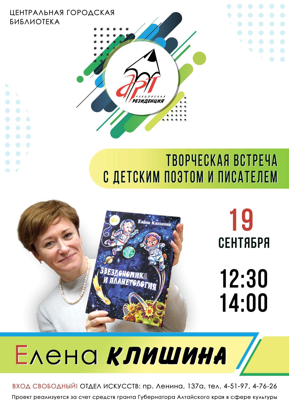 19 сентября в 12.30 в отделе искусств центральной библиотеки состоится творческая встреча с детским поэтом и писателем ЕЛЕНОЙ КЛИШИНОЙ (Ожич). КЛИШИНА Елена Михайловна - член Союза российских писателей и автор книг стихов и прозы для детей: «Как я ничего не ела» (2011), «Мой папа ― мальчик» (2014 г., издательство Clever, Москва), «Старый город» (2016), «Ревень и щавель» (2017), «Девчачьи нежности» (2018), «Дождевяк червяной» (2018), «Звездономика и планетология» (2018), «Энергичные стихи» (2019). Живет в Барнауле, окончила факультет филологии и журналистики Алтайского государственного университета в 1997 году, работает в СМИ.