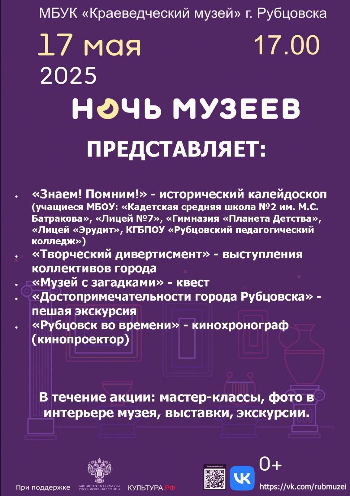 17 мая Рубцовск присоединится к Всероссийской акции «Ночь музеев», которая в Год защитника Отечества пройдет под общей темой «Герои». Площадкой для проведения акции станет краеведческий музей. Мероприятия начнутся в 17:00.