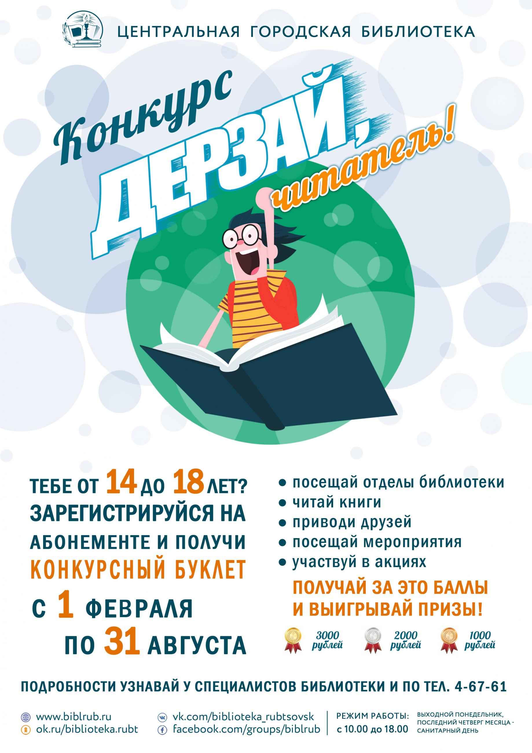 1 февраля 2019 года в Центральной библиотеке стартовал конкурс «Дерзай, читатель!». Приглашаем подростков и молодежь города Рубцовска от 14 до 18 лет принять участие в конкурсе. Вы лучше узнаете библиотеку, прочтете хорошие книги, расширите свой кругозор, сможете выиграть денежные призы. Условия участия:
