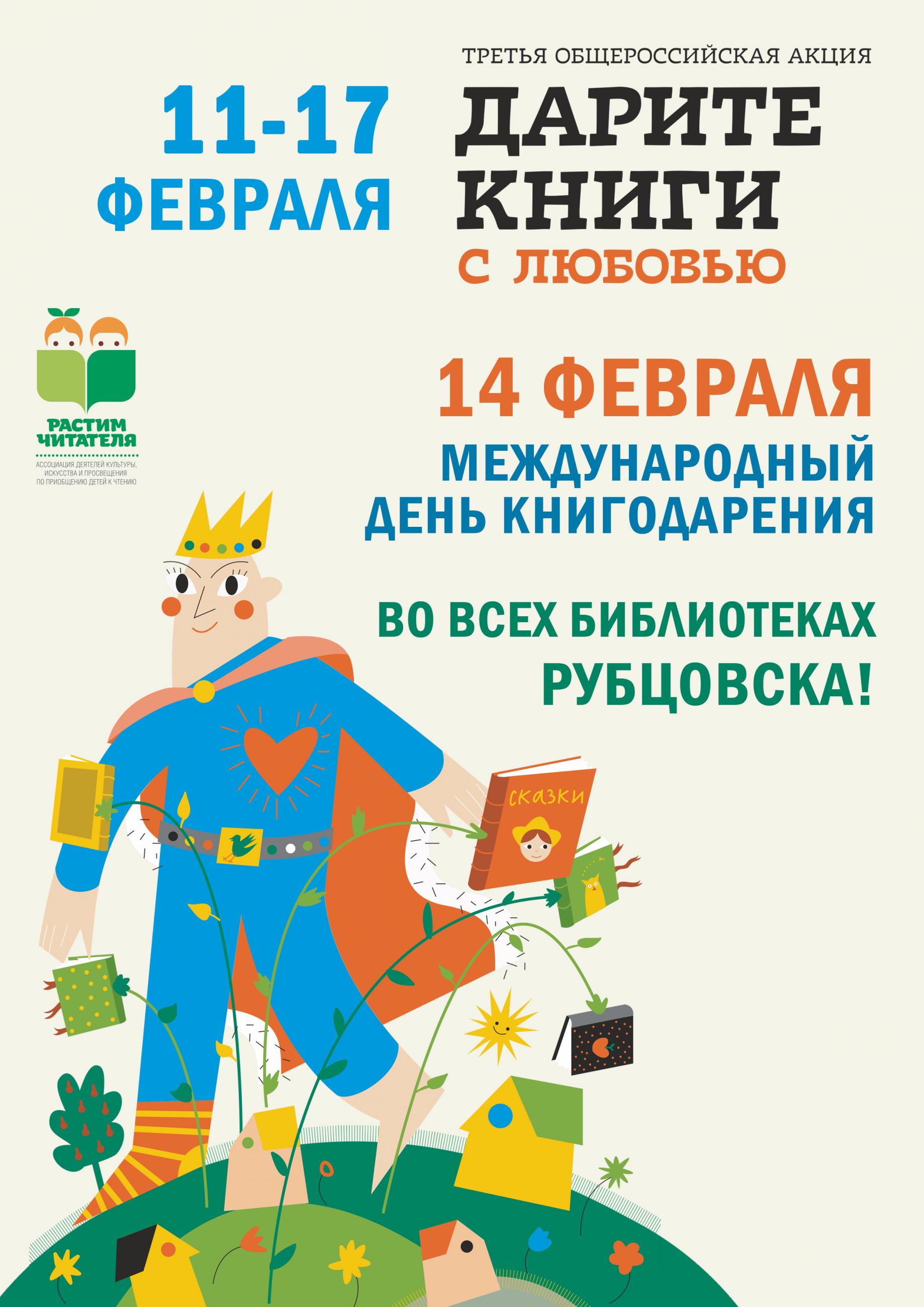 Библиотеки города приглашают рубцовчан принять участие в общероссийской акции «Дарите книги с любовью», приуроченной к Международному дню книгодарения, который отмечается 14 февраля во многих странах мира. Главная идея акции – приобщение к чтению детей и взрослых, развитие традиции дарить друг другу хорошие книги. В этот день, а также в дни проведения акции с 11 по 17 февраля, во всех библиотеках города будут организованы площадки для приема книг и книгообмена. Пройдут встречи с рубцовскими поэтами: в спецбиблиотеке – 13 февраля в 11.30, в библиотеке «Контакт» - 14 февраля в 13.00. В Центральной библиотеке 14 февраля в 16.00 состоится чтецкий концерт «На ладонях степного раздолья».
